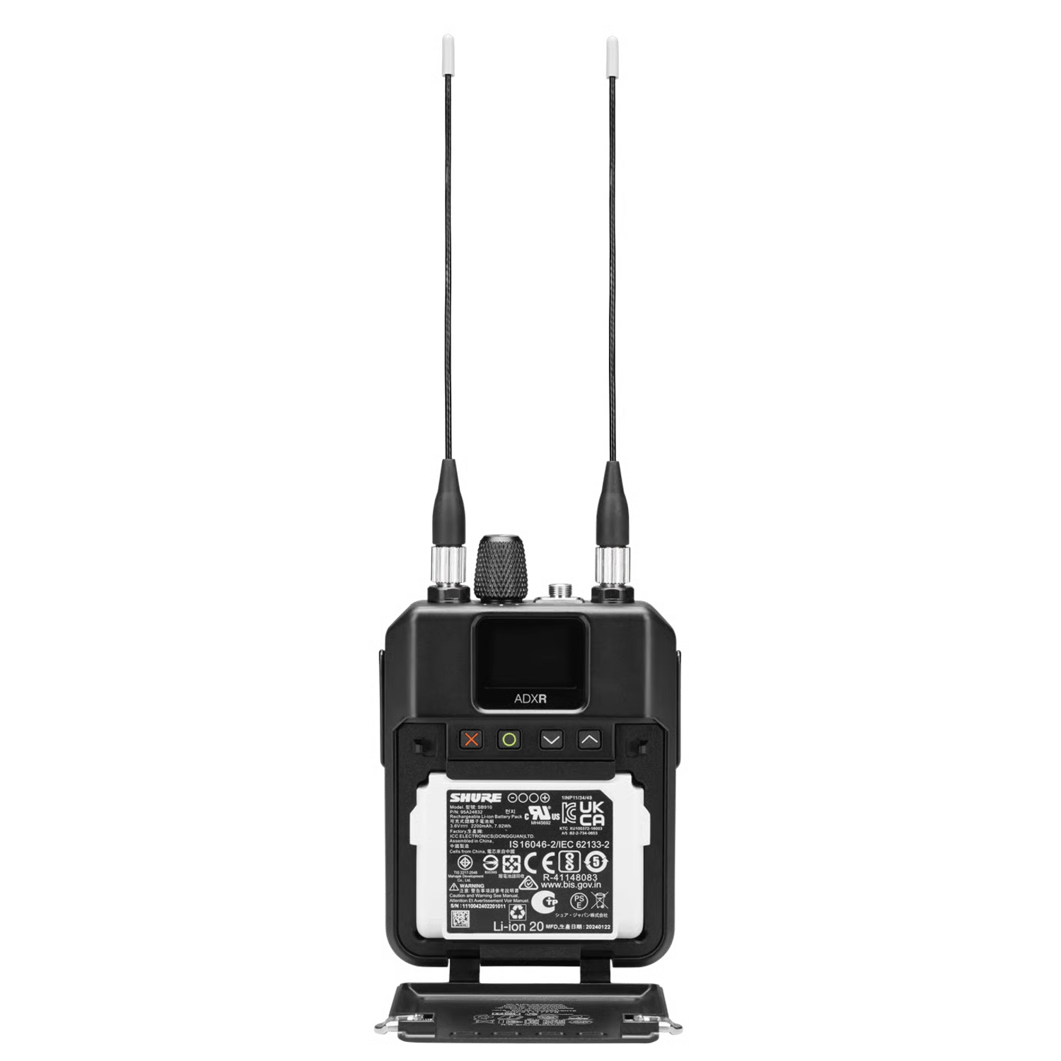 Axient Digital PSM wireless bodypack receiver for onstage in-ear monitoring and broadcast IFB ShowLink technology delivers real-time remote control of all ADXR bodypack wireless receiver parameters from the monitor mix position and elsewhere True Digital Diversity reception combines two discrete RF signals, dramatically improving signal reception and range >115dB of stereo separation Wide tuning range to cover more cities, festivals, and events on tour Patent-pending Automatic Impedance Detection allows ADXR to optimize audio performance and battery life of any professional in-ear monitors CueMode with encryption supports monitoring of different stage mixes and storing of up to 64 separate channels on one bodypack for quick and easy reference Durable, moisture-resistant design with lightweight hybrid aluminum/polymer enclosure Threaded headphone connector for added protection against sweat and moisture External charging contacts for convenient docked charging Includes 2 x SB910 lithium-ion rechargeable batteriesRead more