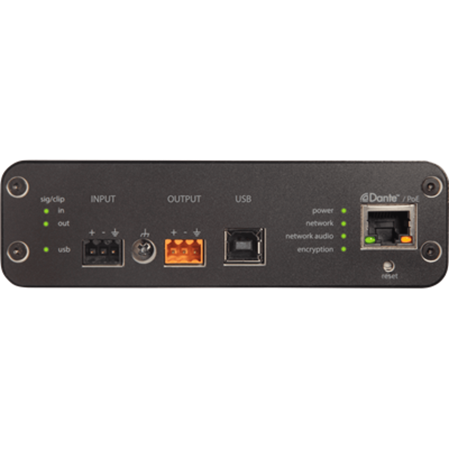 Audio network interface connects up to 4 Dante channels and 1 analog output to a room's audio and video conferencing system via USB connection. Internal matrix mixer offers flexible routing, allowing users to route any input to any output.
