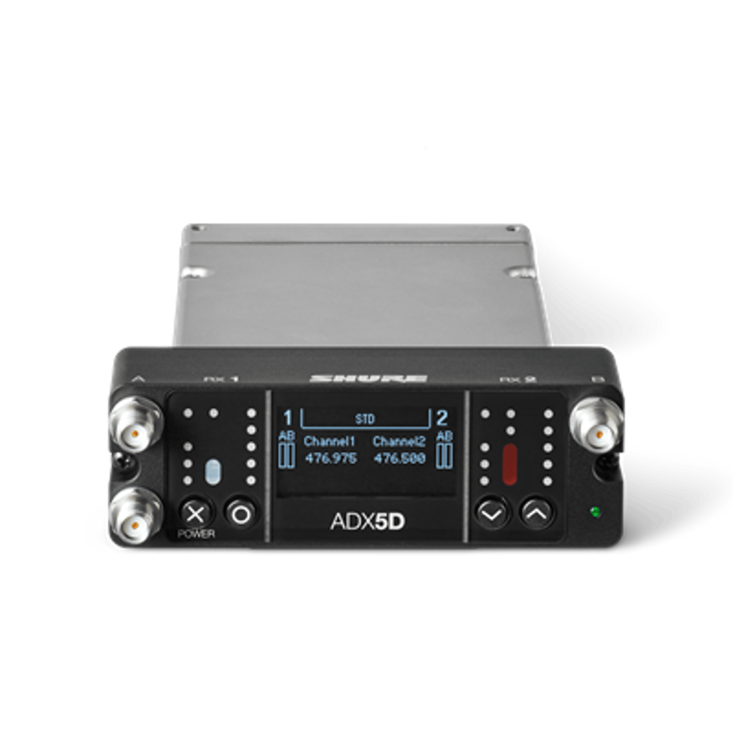 The ADX5D dual-channel wireless receiver delivers superior RF performance, spectrum efficiency and transparent audio quality in a portable slot-in design. Superior, portable, wireless