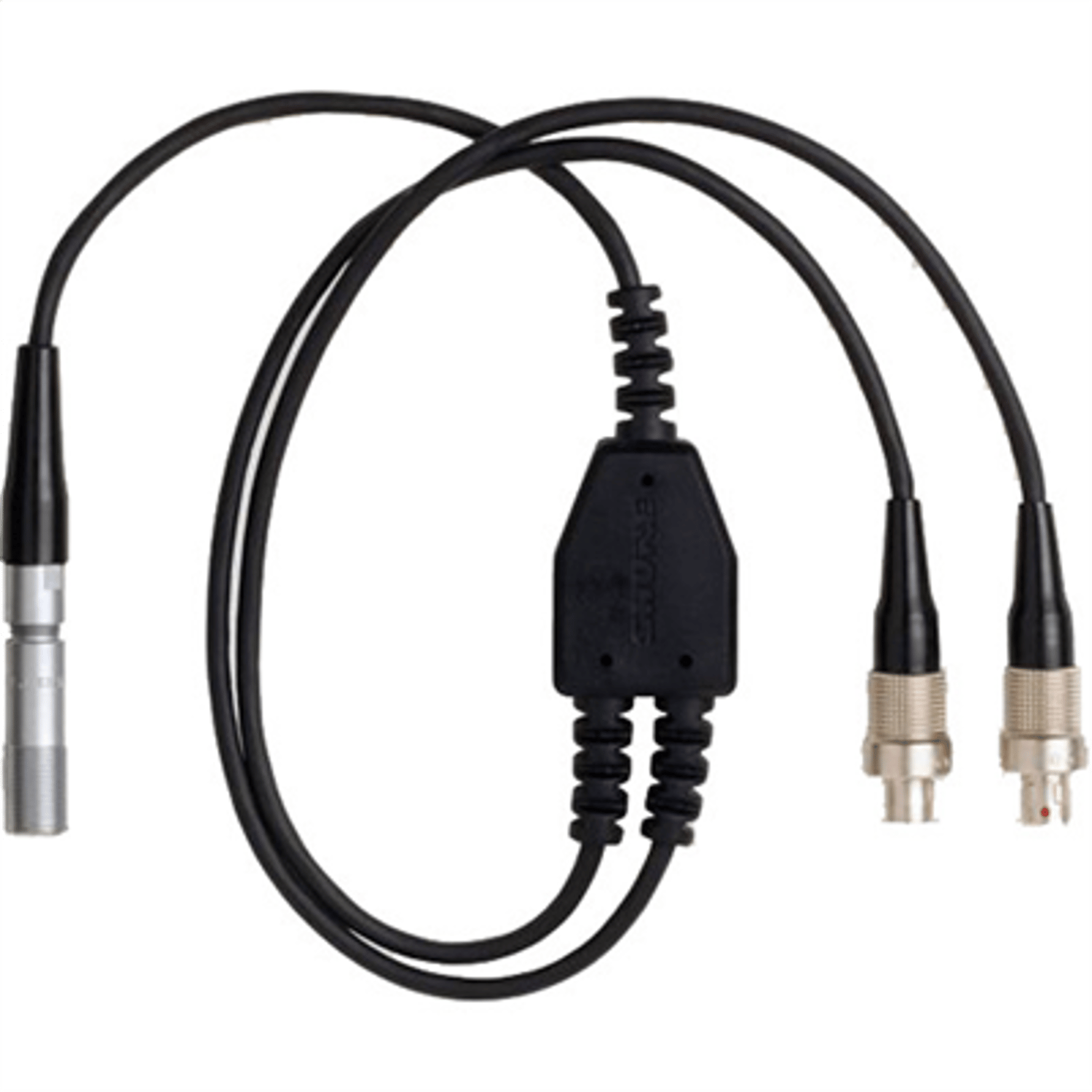 Y-Cable connects a TA4M connector to 2 TA4F connectors for use with 2 AXT100 Bodypack Transmitters.