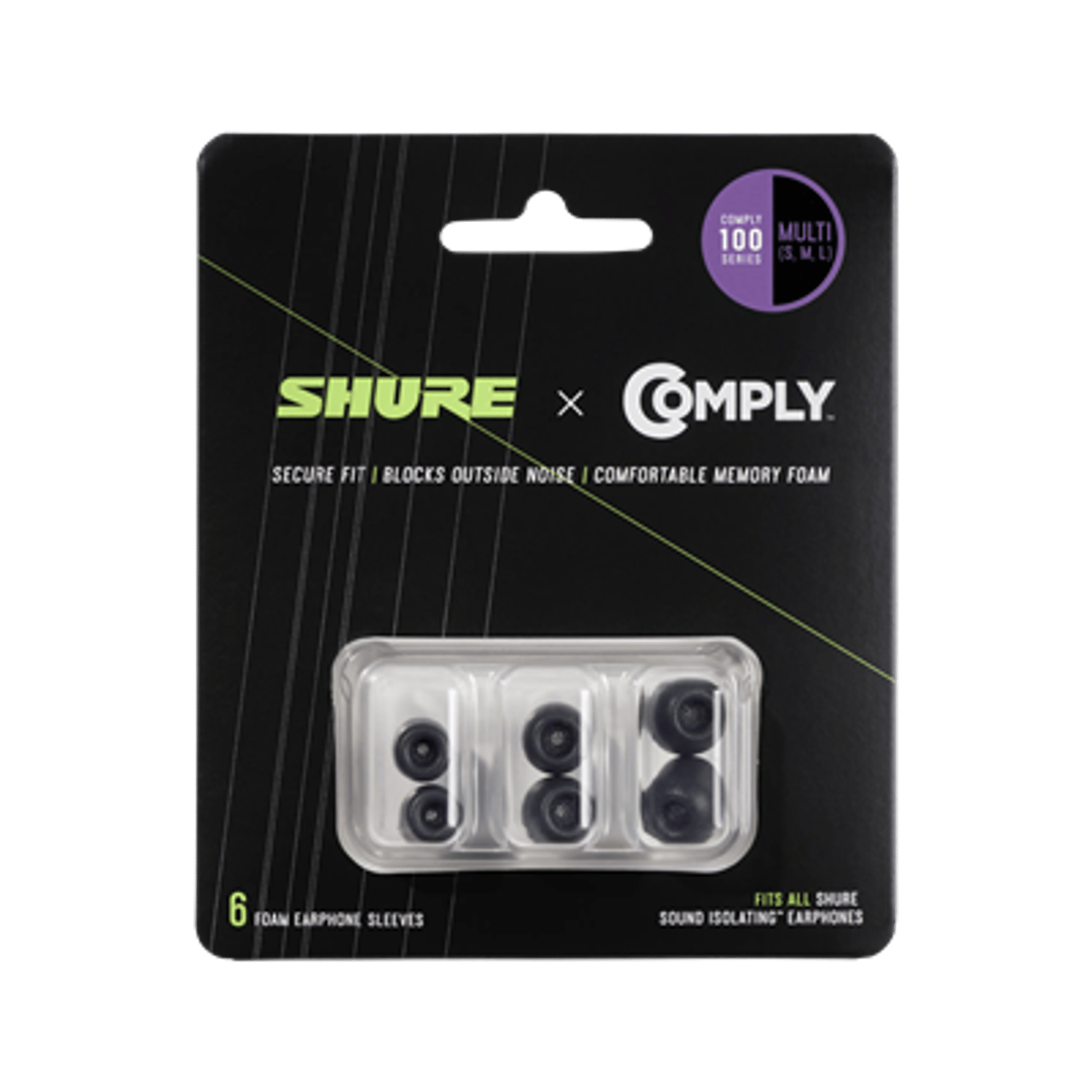 Replacement Comply (100-Series) foam sleeves for Shure Sound Isolating™ Earphones. Soft memory foam tips block out noise and make listening more comfortable, stable and immersive. Set of 6 (3-pair). Multiple sizes.