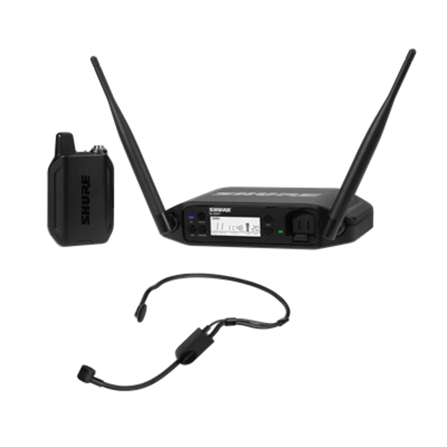 f the automatic frequency management with the new Dual Band Technology provides reliable and consistent performance, while Shure proprietary Lithium-Ion rechargeable batteries provide up to 12 hours of use. Go wireless without complication.Read moreThe new GLX-D+ Dual Band Wireless Headset System features the PGA31 Headset Microphone for spoken word applications and the GLXD4+ tabletop receiver. Go wireless without complication.