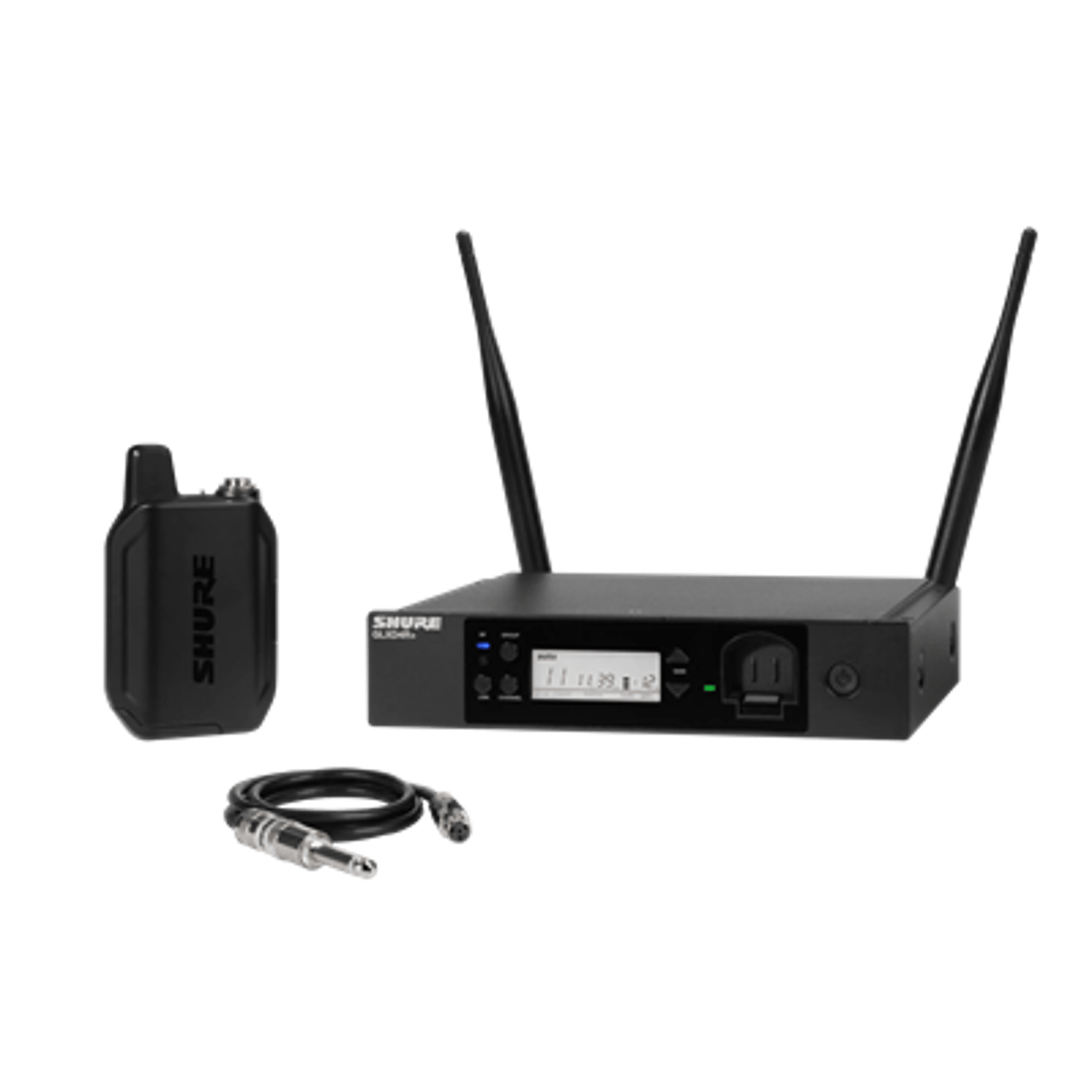 The new GLX-D+ Dual Band Wireless Rack System features the WA302 guitar cable and the GLXD4R+ half-rack receiver. The perfect combination of the automatic frequency management with the new Dual Band Technology provides reliable and consistent performance while Shure proprietary Lithium-Ion rechargeable batteries provide up to 12 hours of use. Go wireless without complication.
