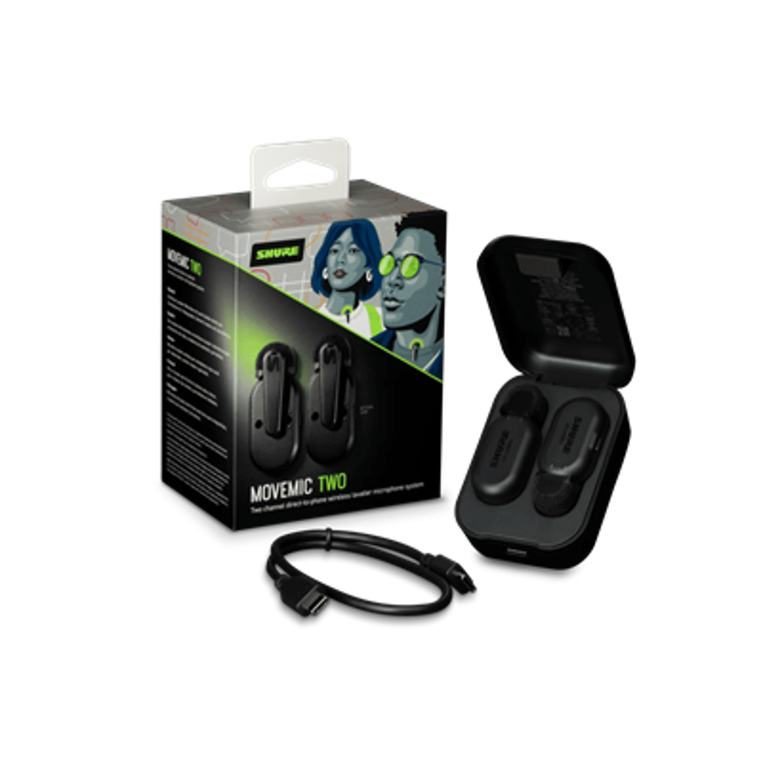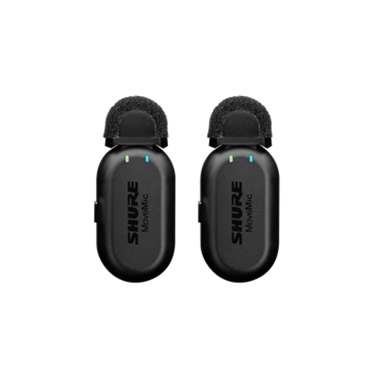 Pocket-sized Professional Audio.Two-channel wireless microphone for mobile set that pairs directly with your iOS or Android device using the Shure MOTIV video or audio apps.Carefully designed to be as small and discreet as possible.Created by the same Shure team behind the professional wireless microphone systems used by the world’s leading artists, venues and festivals. 24 hours of recording on the go: MoveMic lavaliers provide eight hours of battery life within the microphone, with an additional two full charges ready in the convenient charging case.MoveMic Two offers instant setup and connectivity, enabling you to record in seconds without missing a beat.Realize the potential of receiver-free wireless, with two channels of high-quality audio transmitted directly to your phone.Utilizing a custom acoustic design and proprietary wireless software, MoveMic achieves broadcast-quality audio quality beyond traditional mobile devices.The free ShurePlus MOTIV apps allow you to customize your audio and video settings for optimal recording. Configure gain, limiter, EQ, compression, noise reduction and record within the apps.Add the MoveMic Receiver (sold separately) for added compatibility with DSLR and mirrorless cameras, computers, as well as popular third-party mobile apps.Rated IPX4, MoveMic Two is designed to withstand rain, spills and splashes, ensuring your content is not limited by environmental conditions.In the box