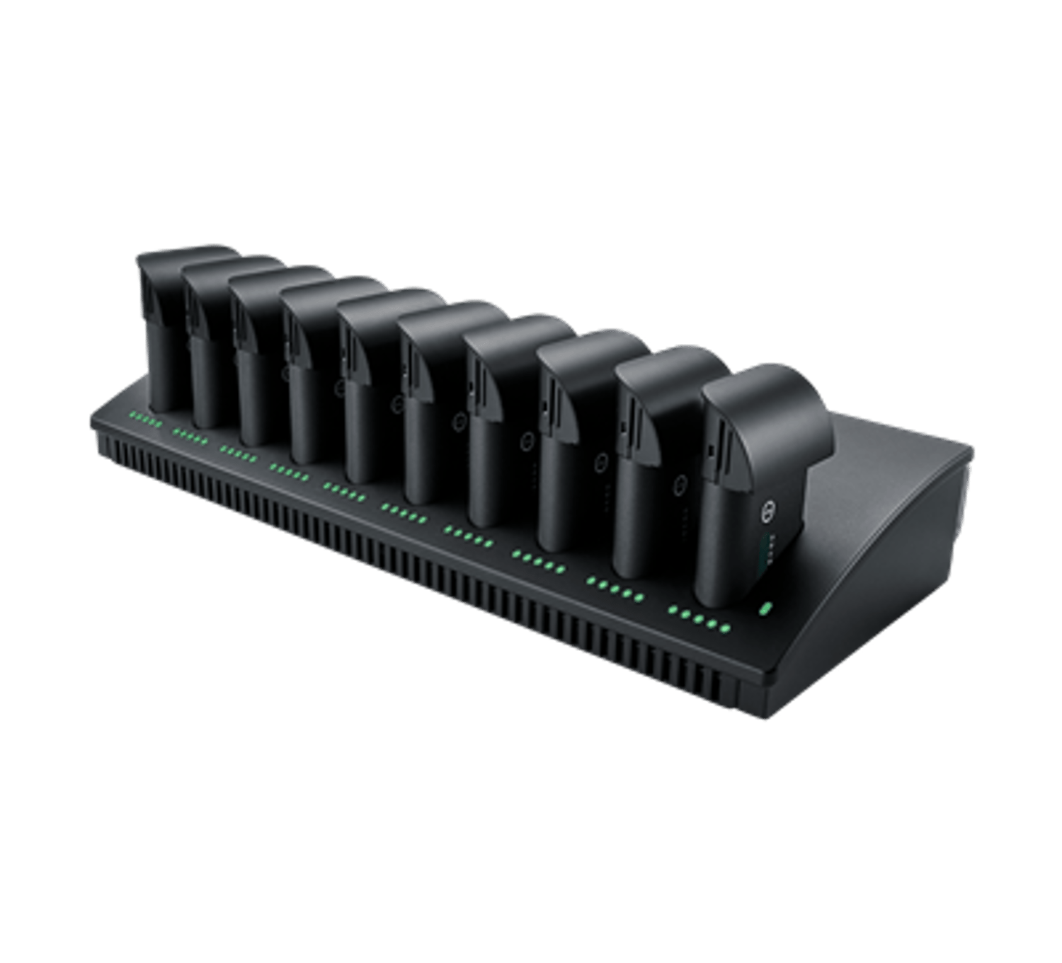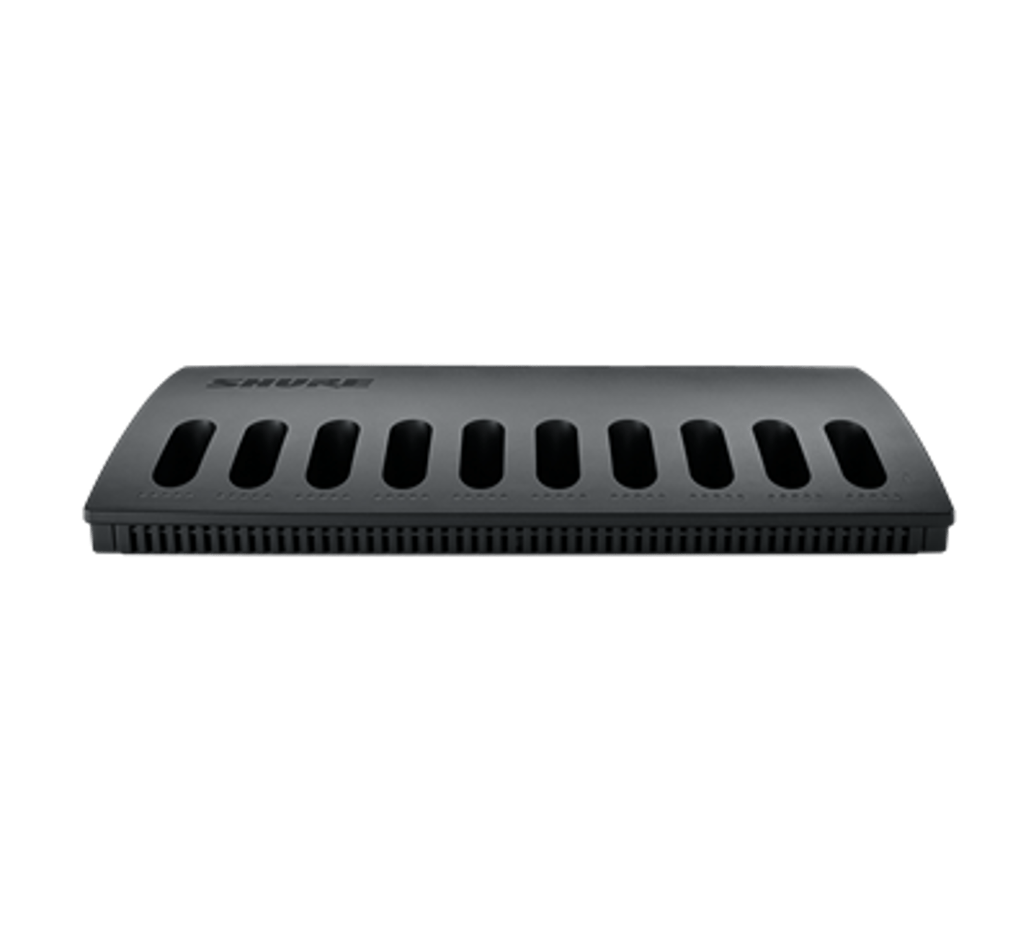 The MXCWNCS Networked Charging Station is designed to blend into conference room aesthetics, keeping SB930 rechargeable batteries for the MXCW640 Wireless Conference Unit at the ready. It accommodates up to 10 SB930 rechargeable batteries, and LED indicators display the charge status for each battery. The MXCWNCS charges 10 batteries to 50% charge in 1.5 hours, and to 100% charge in 4 hours.The RJ-45 Ethernet connection enables remote monitoring of battery charge status via the Microflex Complete Wireless graphical user interface. A storage mode partially discharges batteries for long-term storage or shipment.The MXCWNCS includes an IEC power cable and hardware for mounting to a wall or in a standard 19-inch equipment rack.