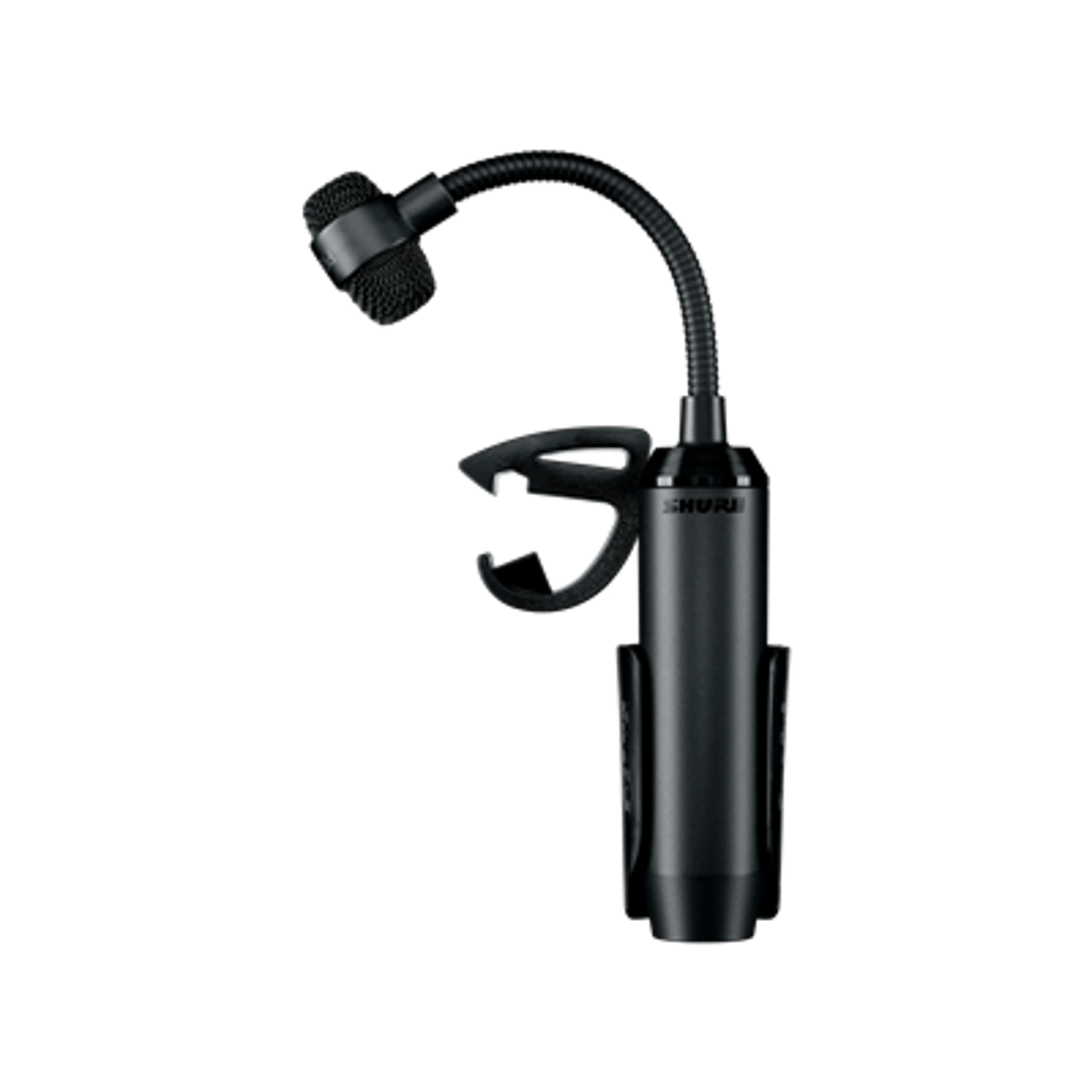 Read moreTailored microphone cartridge design for clear reproduction of drum and percussion sound sources.Flexible gooseneck design makes accurate positioning quick and easyMolded one-piece drum mount for fast, low-profile mounting and removalIntegrated preamplifier uses phantom power and a direct XLR connectionCardioid polar pattern picks up audio from the source while rejecting unwanted noiseUpdated industrial design with black metallic finish and grille for unobtrusive visual presenceAvailable with XLR Cable (15 ft / 4.6 m)Zipper pouch included for additional protection during storage or transportLegendary Shure quality design and construction for exceptional performance in rigorous environments