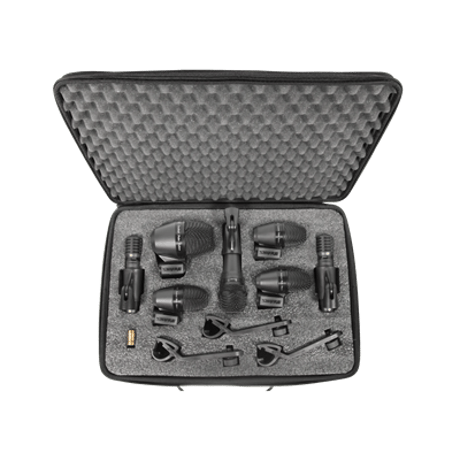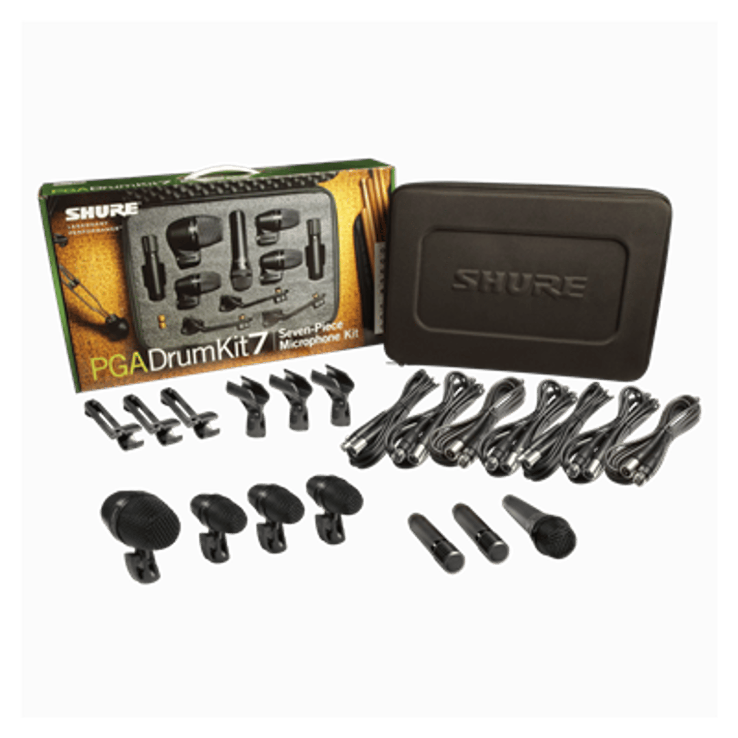 The PGADRUMKIT7 Drum Microphone Kit is a complete package of professional quality microphones, designed to provide excellent sound for full drum kit performance and recording. Included in the PGADRUMKIT7 are one PGA52 kick drum microphone, three PGA56 drum microphones, one PGA57 instrument microphone and two PGA81 instrument microphones, along with three drum mounts, seven XLR-XLR cables, and a carrying case.