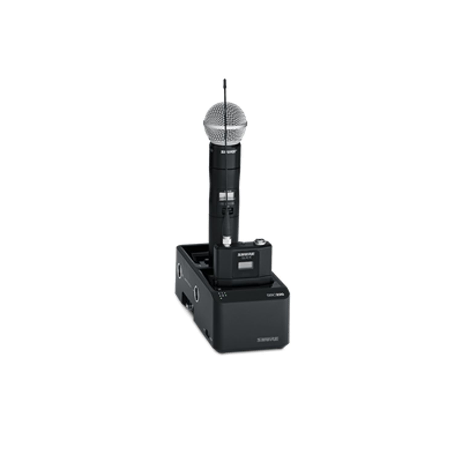 Networked Charging Station for docked charging, storage and battery status for any combination of two SB900B batteries or ULXD1, QLXD1, AD1 (bodypack) or ULXD2, QLXD2 or AD2 (handheld) wireless transmitter.