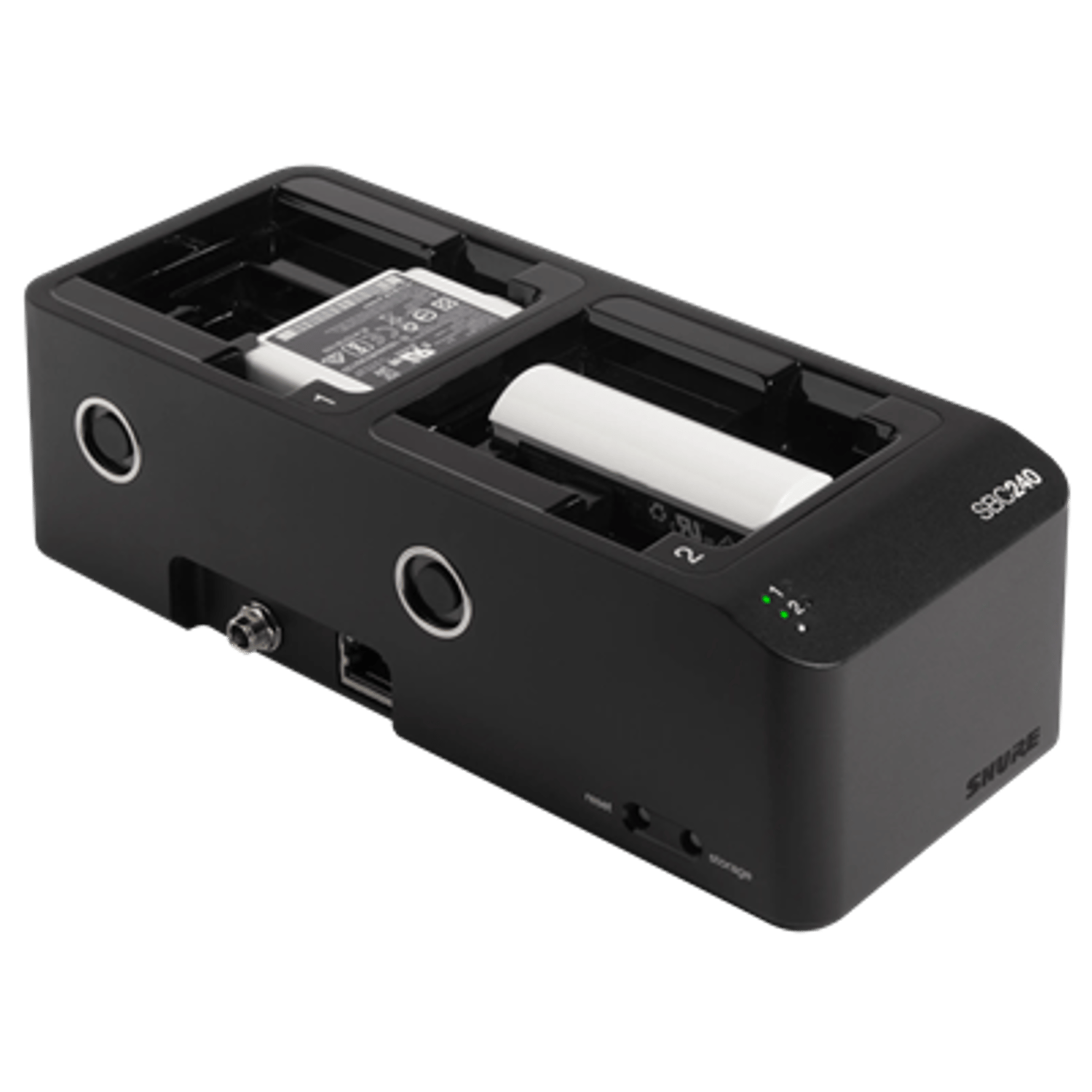 The SBC240 networked docking charger provides a compact charging and storage solution for any combination of 2 SB910/SB920 batteries or ADX1, ADX2, or ADX2FD transmitters using Shure rechargeable batteries. The charger is network-enabled to allow for remote monitoring of charger and battery parameters using Shure Wireless Workbench software. Connect up to 4 SBC240 chargers together to share power and network connectivity.