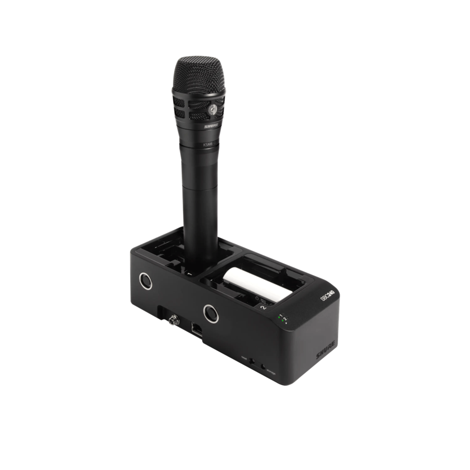 The SBC240 networked docking charger provides a compact charging and storage solution for any combination of 2 SB910/SB920A batteries or ADX1, ADX2, or ADX2FD transmitters using Shure rechargeable batteries. The charger is network-enabled to allow for remote monitoring of charger and battery parameters using Shure Wireless Workbench software. Connect up to 4 SBC240 chargers together to share power and network connectivity.