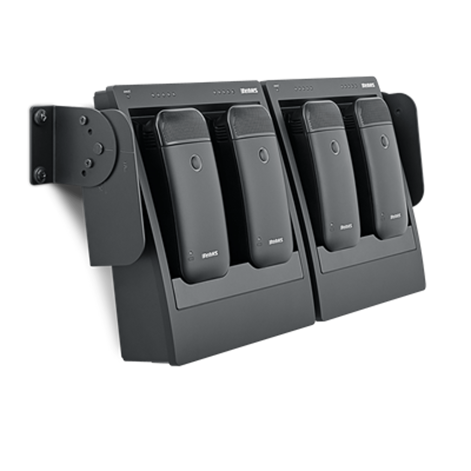 Compact networked two-bay docking station charges ULXD6 or ULXD8 transmitters and can be rack-mounted or wall-mounted with optional URT3 rack tray.