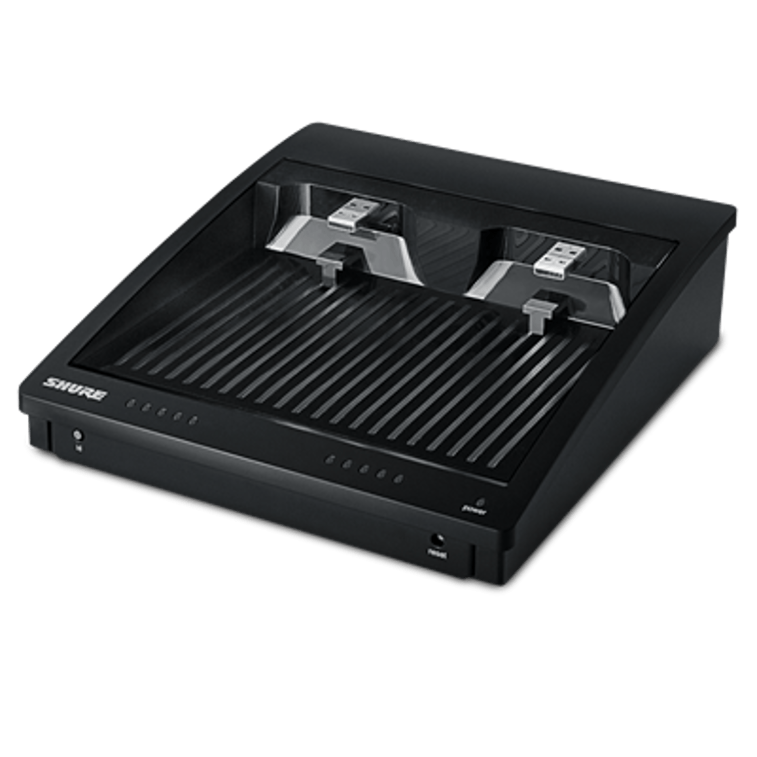 The SBC250 Networked Charging Station allows up to two ULXD6 or ULXD8 transmitters that are equipped with the sb900b rechargeable battery to be charged quickly and conveniently. Transmitters simply slide into the charger; it is not necessary to remove the sb900b battery. Bi-color LEDs indicate charging status. When connected to a network, the charging status of each transmitter can be viewed remotely. Transmitter settings or firmware can be updated while the transmitters are in the charger using Shure Wireless Workbench® or SystemOn™ Audio Asset Management software, or through a third-party room control system. The SBC250 can be also be rack or wall-mounted with optional URT3 rack tray.