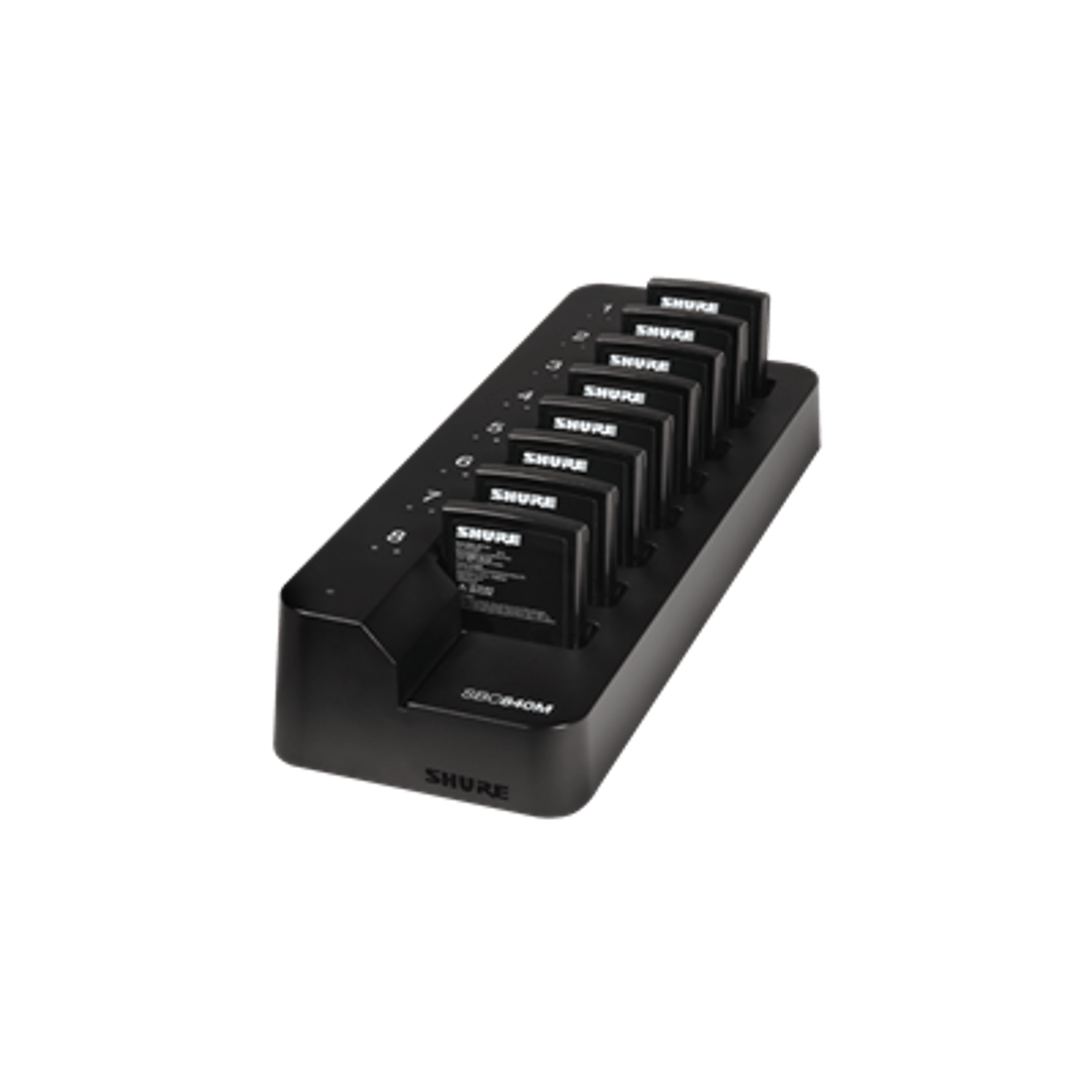 The SBC840M networked charger provides a compact charging and storage solution for up to 8 SB910M batteries. The charger is network-enabled to allow for remote monitoring of charger and battery parameters using Shure Wireless Workbench software.