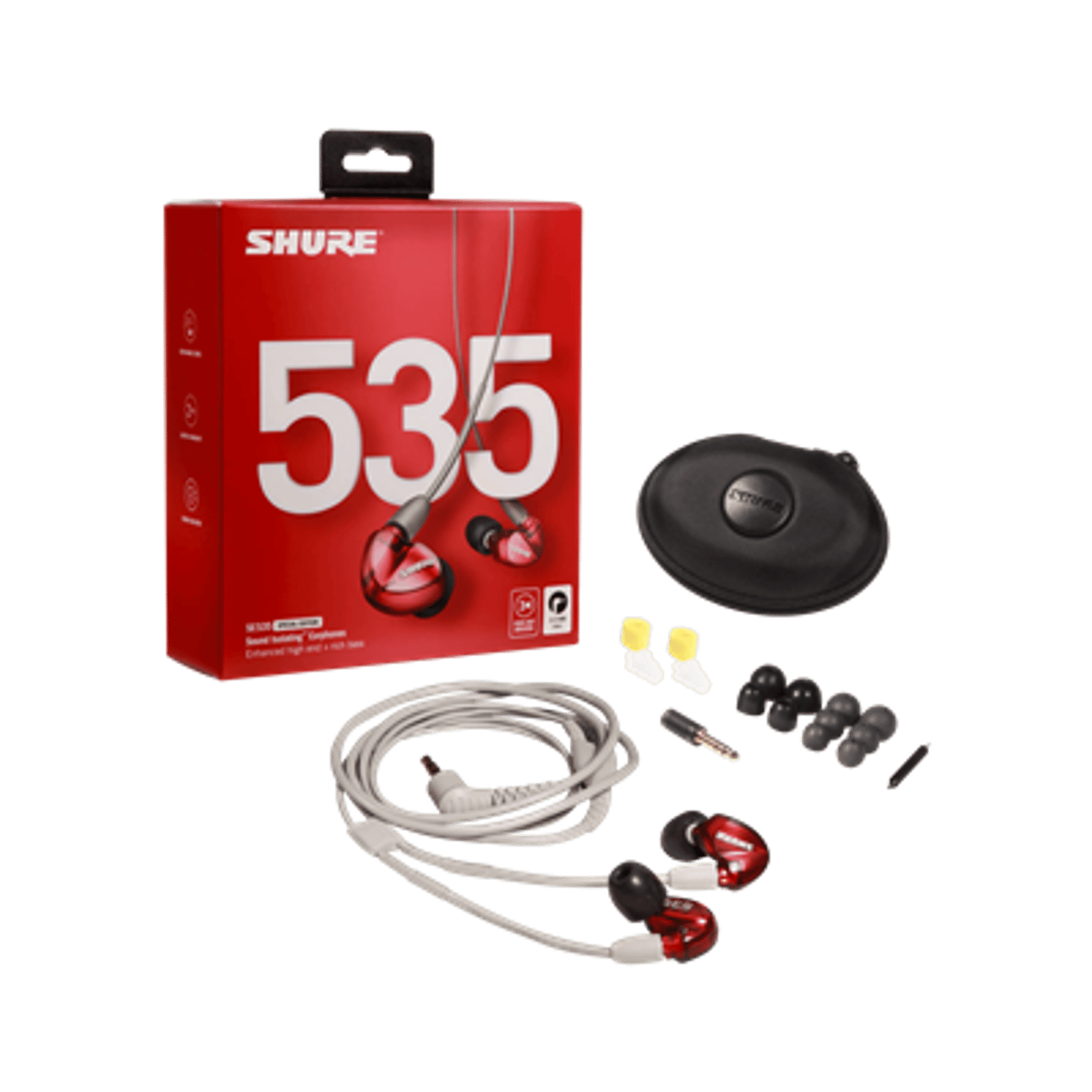 Cinematic wonder.Triple high-definition drivers deliver spacious sound and rich bass for cinematic audio in a convenient and portable package.Detachable cable system enables multiple connectivity options for long-term device compatibility, upgrades, and ease of maintenance.Sound Isolating design blocks up to 37 dB of outside noise for immersive listening no matter where you are.Secure, over-the-ear configuration keeps earphones in place and cables out of the way for unmatched, long-wearing comfort.Special Edition version (LTD) with a distinctly tuned frequency filter and a unique color scheme of red earphones paired with light gray 3.5 mm audio cable in shortened 46” length.Includes light gray 3.5 mm audio cable, ¼” adapter, premium carrying case and fit kit with wide variety of sleeves.In the box