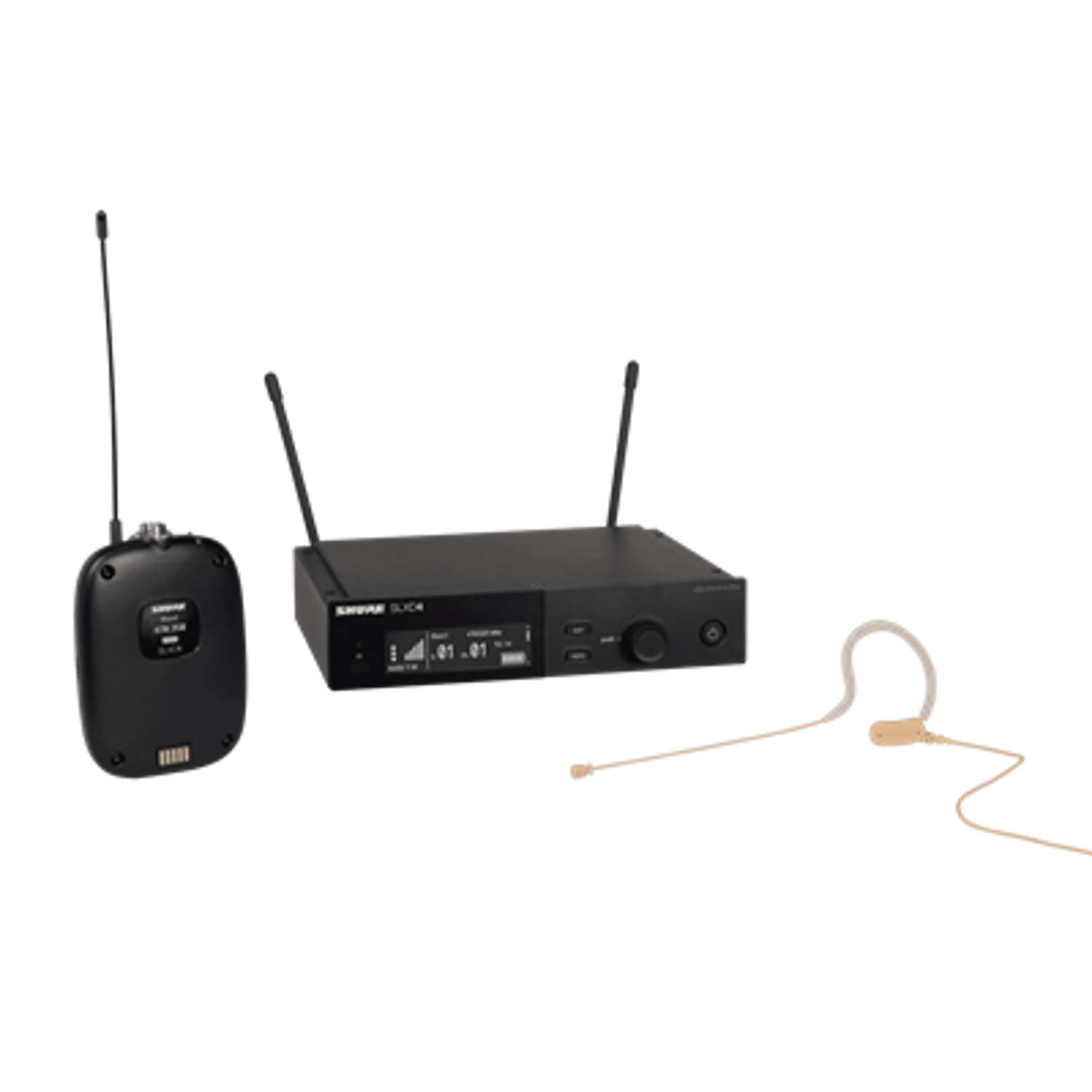 Shure SLXD14E with MX153T (beige), delivers impeccable audio quality and RF performance with wide-tuning, High Density mode, and encryption. Features durable metal construction, rechargeable power with dockable charging, and black or nickel finish options.
