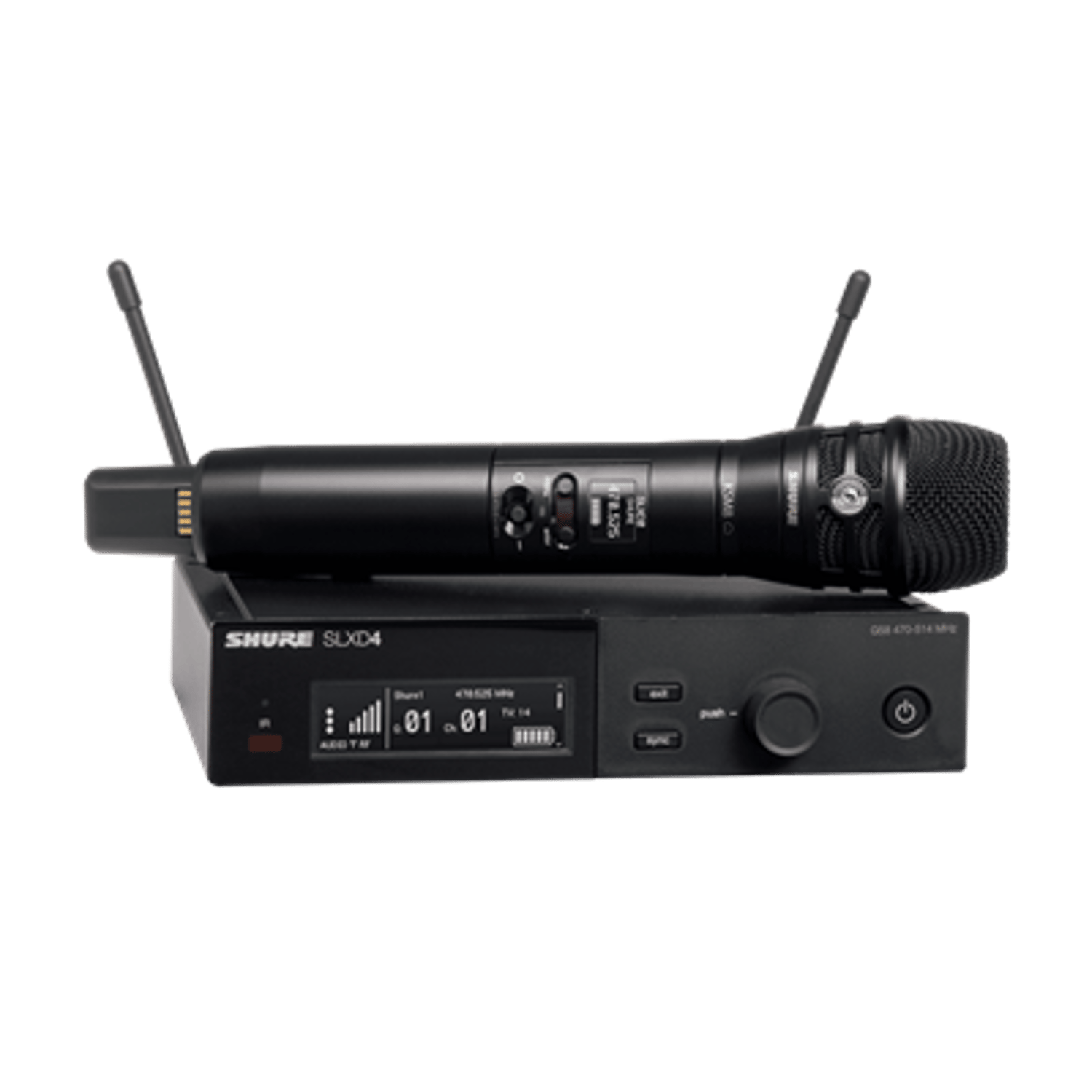 Shure SLXD24E with K8B capsule, delivers impeccable audio quality and RF performance with wide-tuning, High Density mode, and encryption. Features durable metal construction, rechargeable power with dockable charging, and black or nickel finish options.