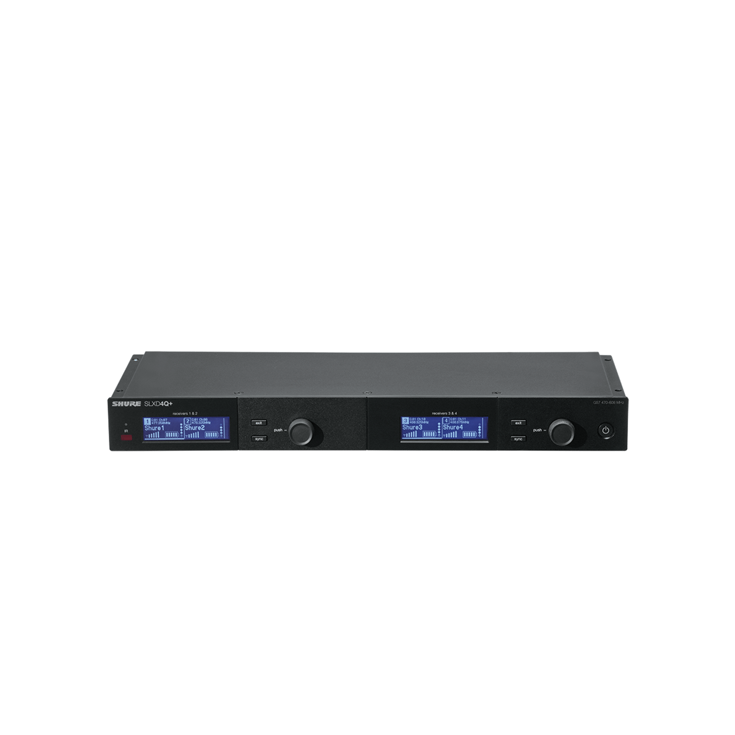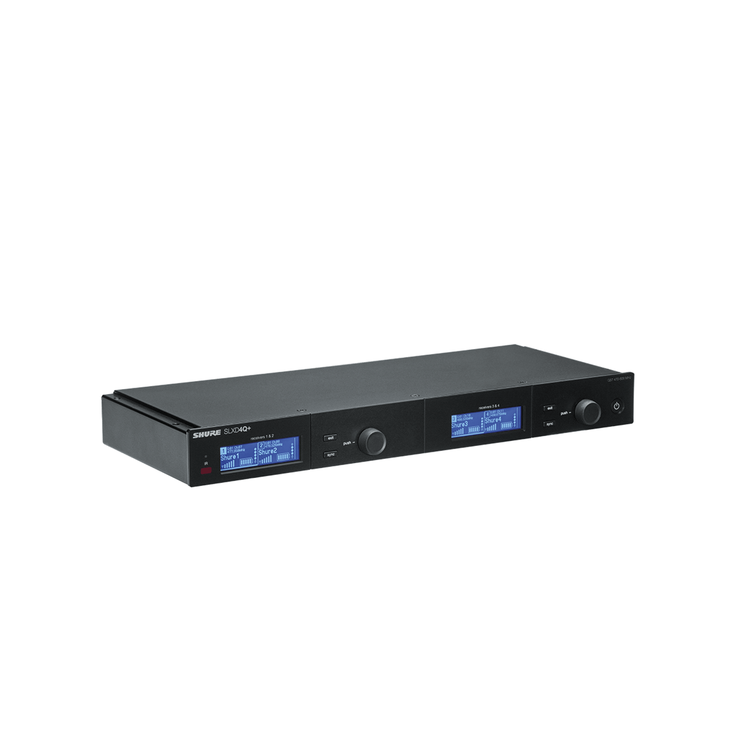 138MHz Wide Tuning Range. Allows every SLX-D Quad Receiver to be used country-wide, without the need to manage narrow range receiver inventory. Four channels in one rack space. Space-saving design allows you to expand with minimal impact. Audio Summing. Don’t have 4 open mixer channels? Set and combine audio levels for three, two, or one Quad Receiver audio output choices to match your open inputs. RF Cascade. Create an 8 channel SLX-D receiver system by simply connecting two SLX-D Quad Receivers. No additional accessories or cables required. Standard and Dante Compatibility. Every SLXD4Q+ Quad Receiver has 4 XLR and 4 ¼” outputs and 2 local ethernet connections. The SLXD4QDAN+ includes those while upgrading to ethernet-based Dante connectivity. Compatibility