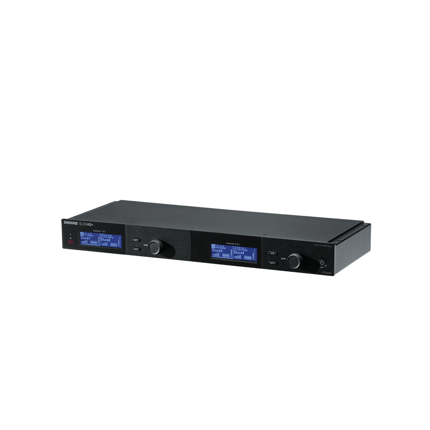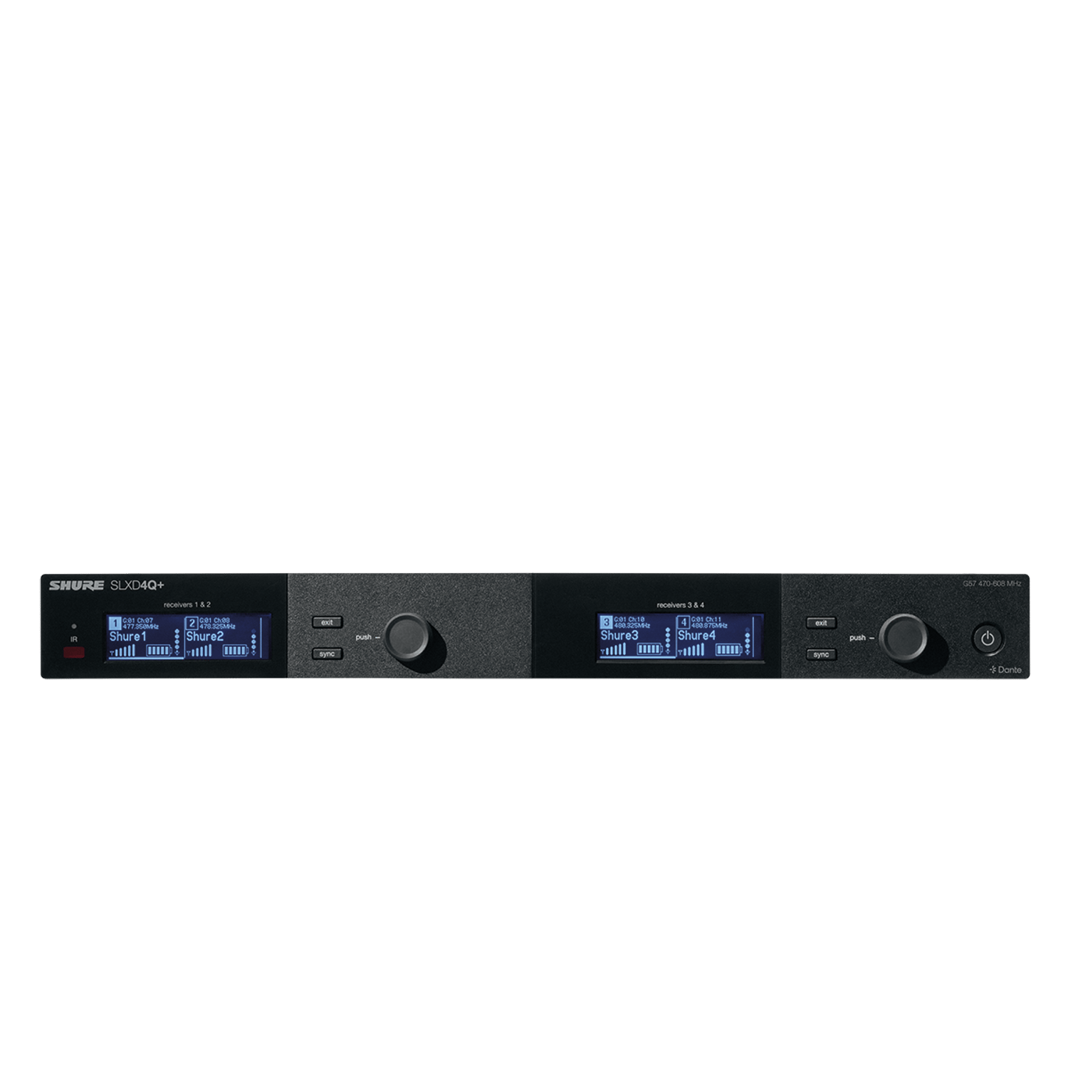 138MHz Wide Tuning Range. Allows every SLX-D Quad Receiver to be used country-wide, without the need to manage narrow range receiver inventory. Four channels in one rack space. Space-saving design allows you to expand with minimal impact. Audio Summing. Don’t have 4 open mixer channels? Set and combine audio levels for three, two, or one Quad Receiver audio output choices to match your open inputs. RF Cascade. Create an 8 channel SLX-D receiver system by simply connecting two SLX-D Quad Receivers. No additional accessories or cables required. Standard and Dante Compatibility. Every SLXD4Q+ Quad Receiver has 4 XLR and 4 ¼” outputs and 2 local ethernet connections. The SLXD4QDAN+ includes those while upgrading to ethernet-based Dante connectivity. Compatibility