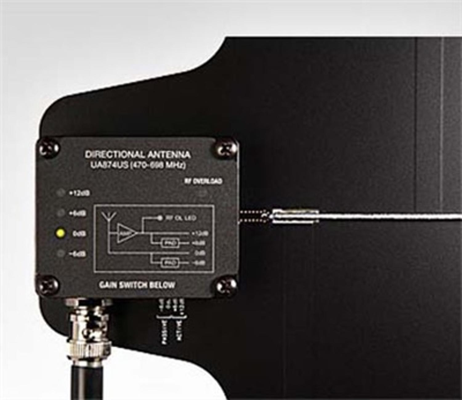 The UA874 replaces the UA870. UA874 uses a log periodic dipole array to produce a cardioid pattern towards the desired coverage area with greater rejection of RF signals outside the coverage area when compared to standard ½ wave omnidirectional antennas. An integrated amplifier with four gain settings compensate for varying degrees of coaxial cable signal loss.