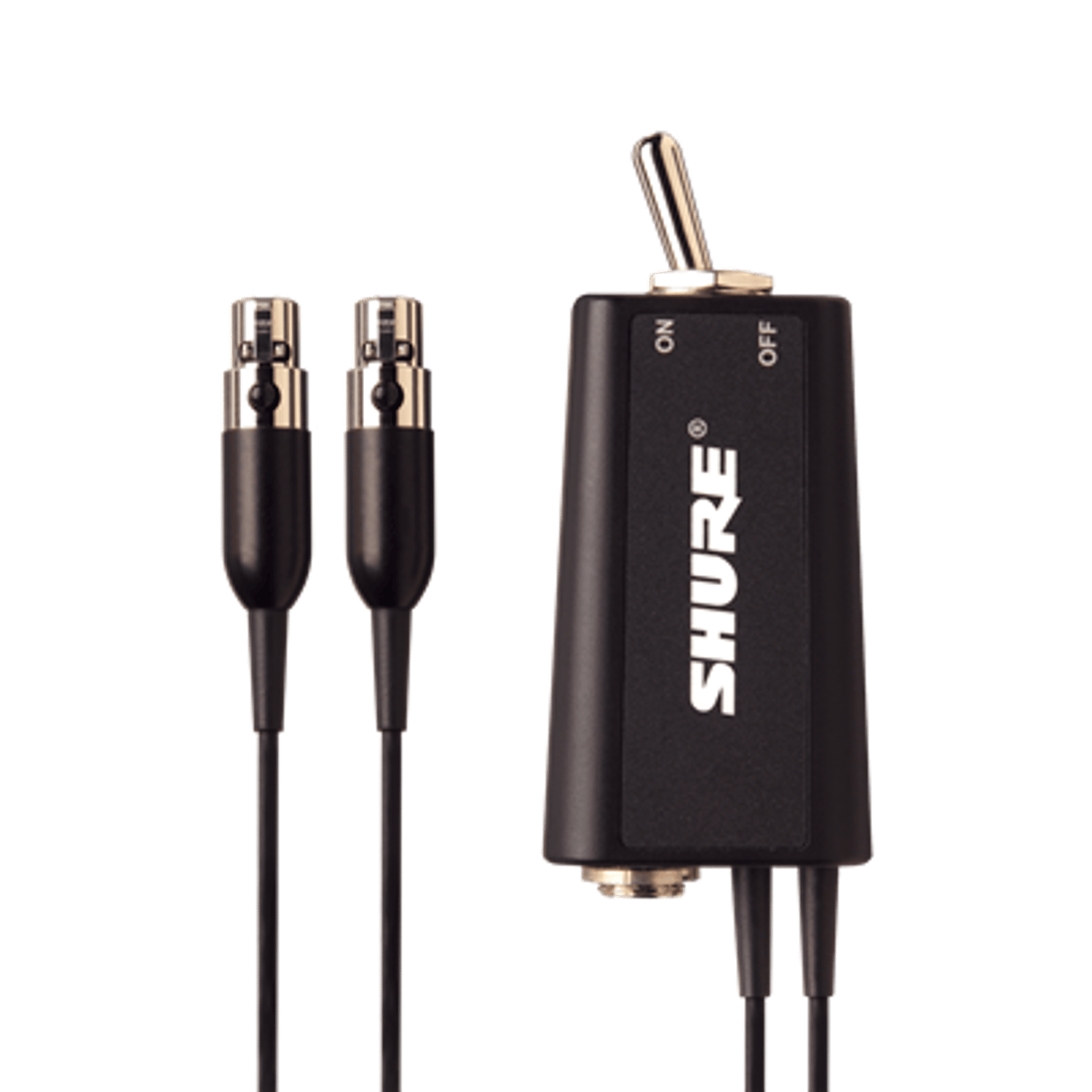 In-line bodypack mute switch allows the performer to easily mute 2 bodypack transmitters.