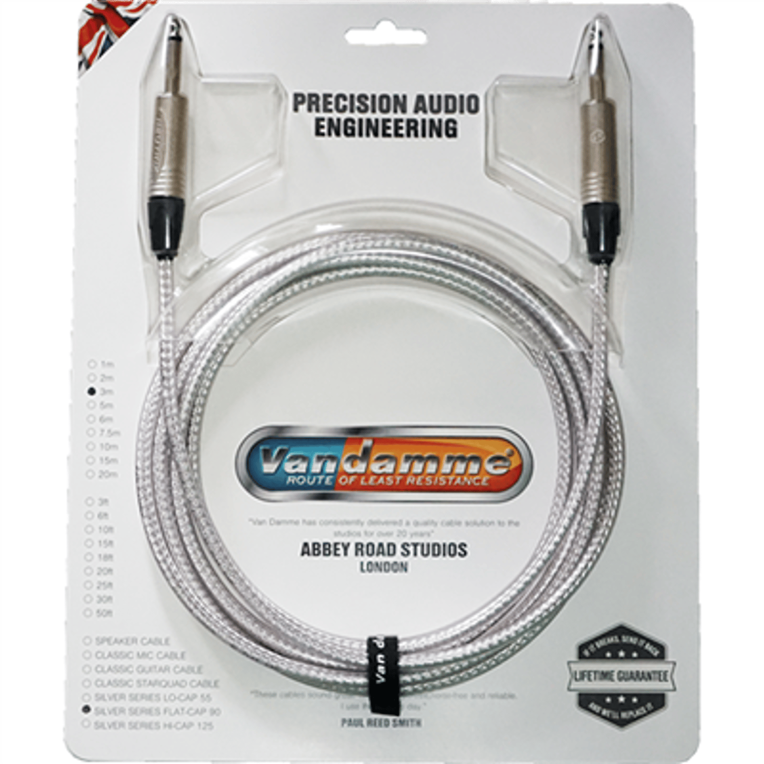 Van Damme Silver Series FLAT-CAP 90p/F Cables are high quality low capacitance cables. The Van Damme Silver Series deliver crystal clear transmission for both single coil and humbucker equipped guitars and basses.