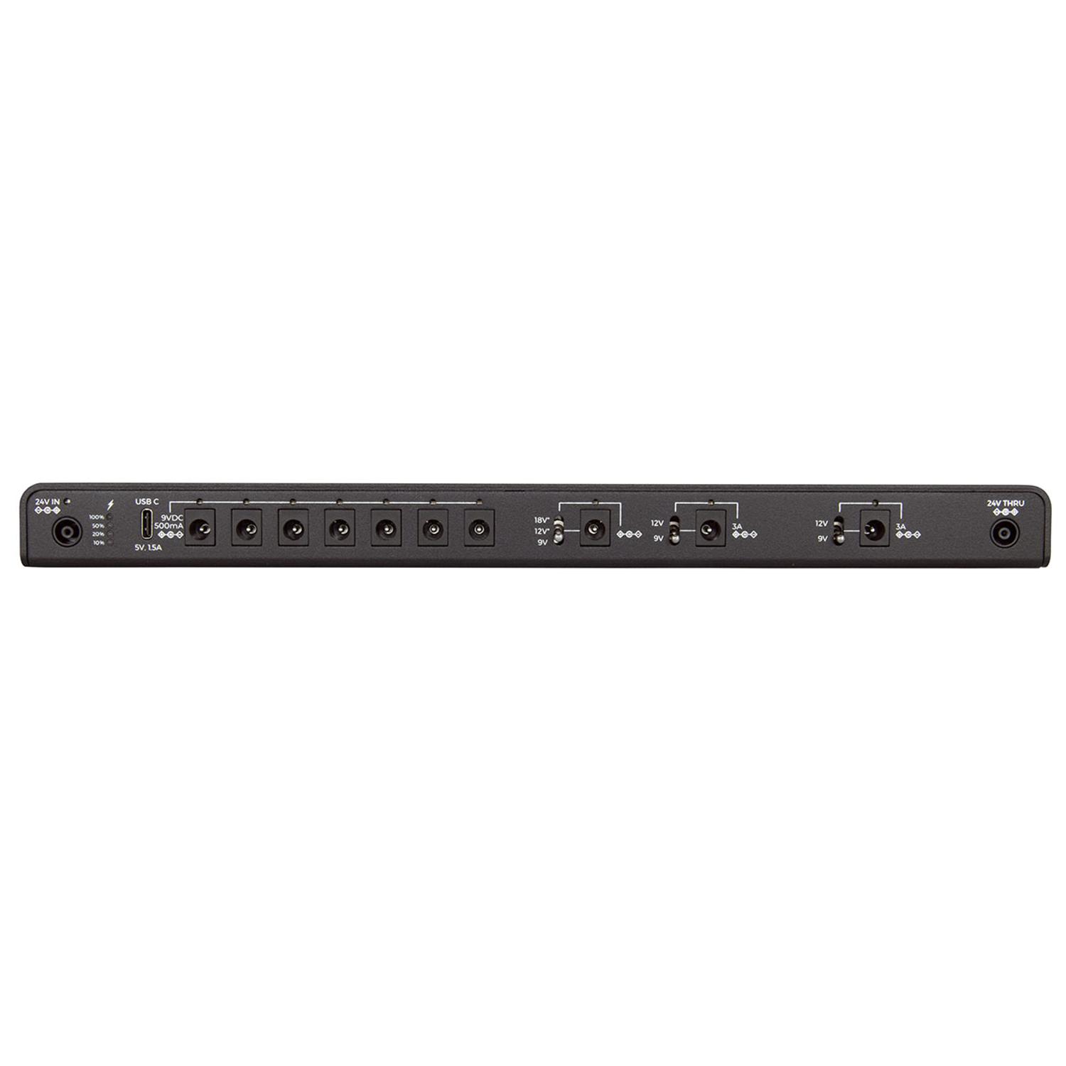 Key features Two 3A outputs with selectable 9V or 12V Seven isolated 9V outputs (up to 500mA each) 9V/12V/18V variable output Modern switch-mode architecture = clean, quiet power Optional linkable configuration using a 24V power link 1.2-inch design fits under nearly any pedalboard Custom 2.1mm cables with short straight and right-angle plugs LED output indicators + onboard power meter What’s in the Box?