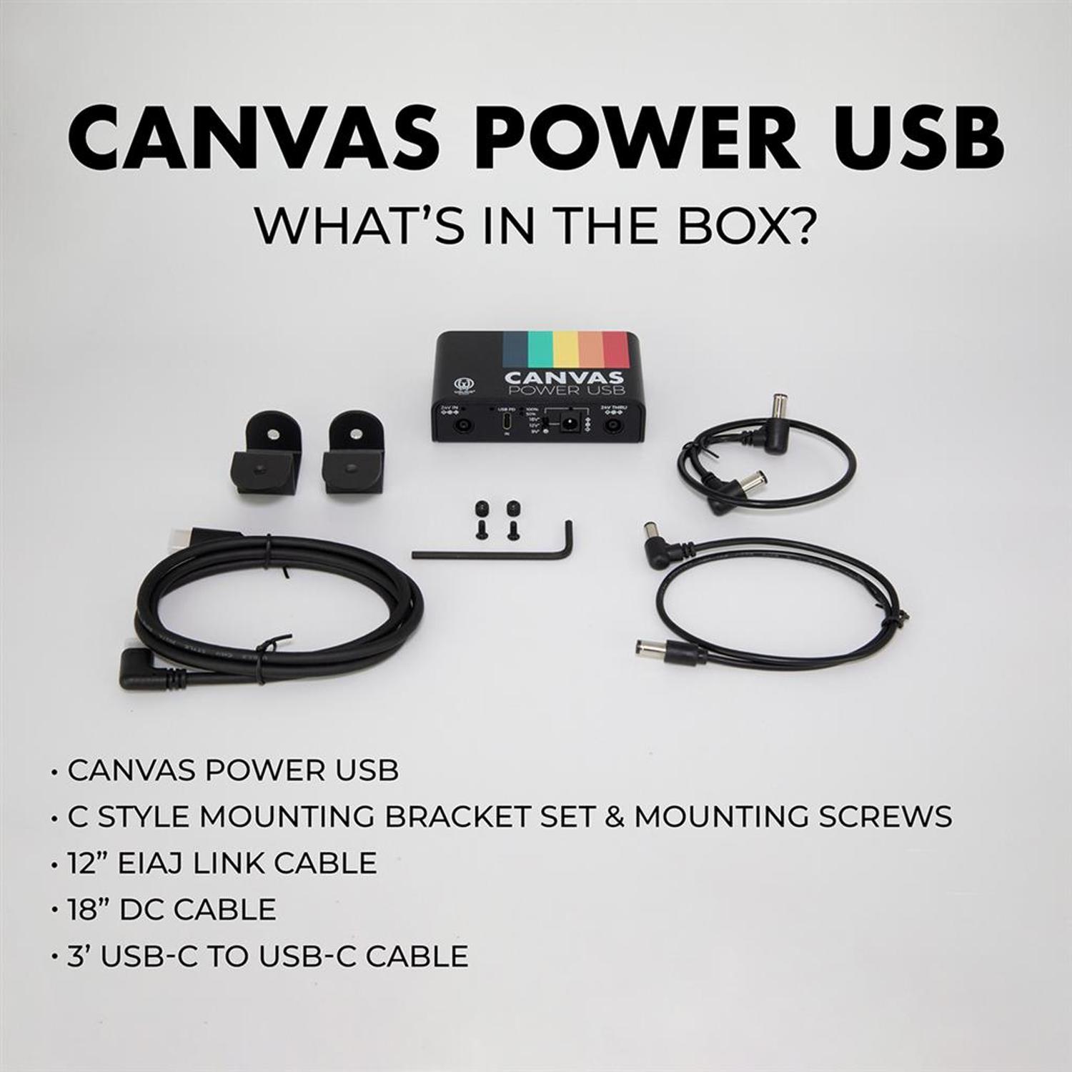 What’s in the Box? 1 x Canvas USB Power Supply 46 cm Straight to right angle DC Cable – Qty. 1 30 cm EIAJ Link Cable – Qty. 1 91 cm USB-C to USB-C Cable – Qty. 1 C style mounting bracket set w/screws M3 Hex Key Read moreHow it works Power USB works as a bridge that goes between your Canvas Power unit (or other power supplies with a 24V EIAJ input) and its power brick or USB battery pack. Place the Power USB before your current power supply and connect them from the Power USB’s 24V Thru to your main supply’s 24V In with the included EIAJ cable. Your pedals can now be powered by a USB PD supply such as an adapter (like the one connected to your MacBook), battery pack, OR your Canvas Power brick! Power USB will prioritize the normal DC brick supply if present or use the USB PD input if no power brick input is detected.