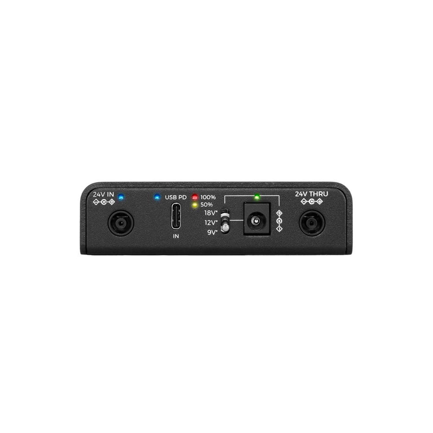 How it works Power USB works as a bridge that goes between your Canvas Power unit (or other power supplies with a 24V EIAJ input) and its power brick or USB battery pack. Place the Power USB before your current power supply and connect them from the Power USB’s 24V Thru to your main supply’s 24V In with the included EIAJ cable. Your pedals can now be powered by a USB PD supply such as an adapter (like the one connected to your MacBook), battery pack, OR your Canvas Power brick! Power USB will prioritize the normal DC brick supply if present or use the USB PD input if no power brick input is detected.