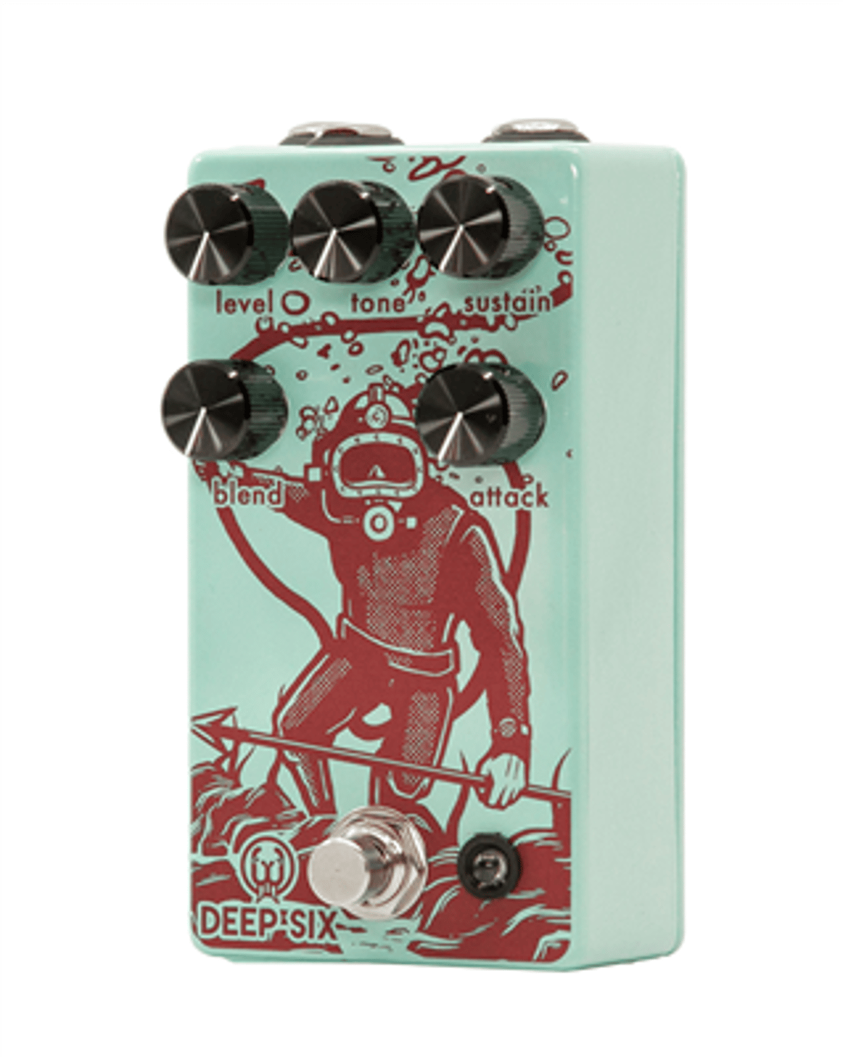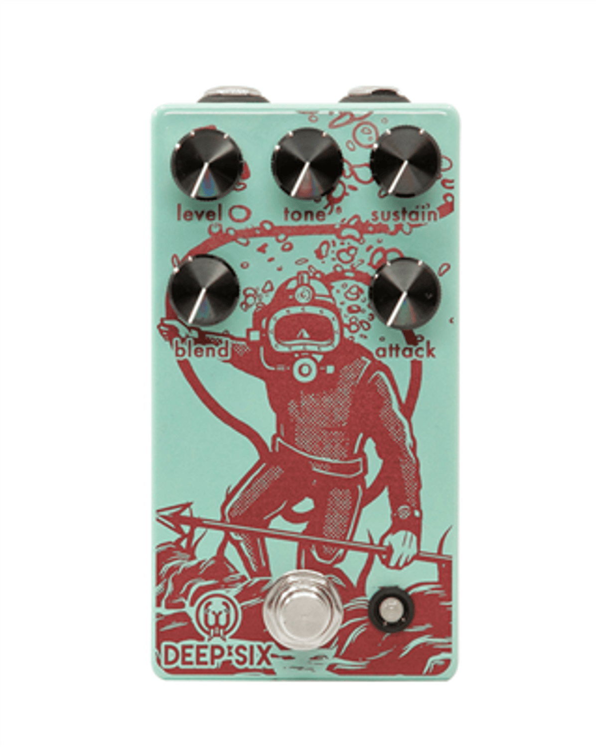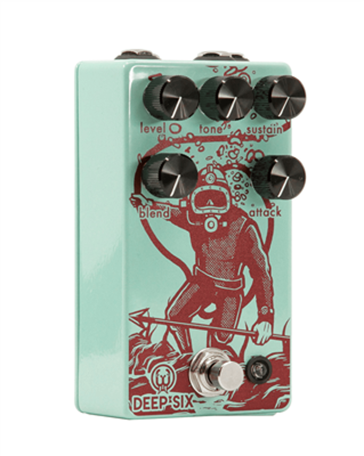 Added Tone knob (bass cut) for the ability to shape the low end of your guitar signal. Soft switch/relay bypassing for smoother more reliable operation.Converted to SMD technology for a more robust design and product longevity.High quality SMD components used for a more hi-fi sound.Moved to top mounted jacks.Updated art by Adam Forster that gives a humble nod to the original art that started it all. The Deep Six is a true bypass studio-grade compressor in stomp box form, inspired by the performance of the Universal Audio 1176 with the simplicity of the Ross and Dynacomp. Offering a Level, Sustain, Attack, and Blend control, the Deep Six will give you unmatched versatility at a price you can afford.