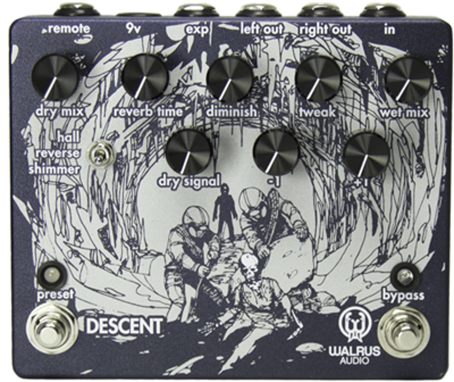 The Descent was designed to create ambient textures of sound, from thick and endless hall reverbs to symphonic shimmers. The Descent is a three mode reverb system; hall, reverse, and shimmer. In each mode, the user has the ability to feed +1 and -1 octaves into the reverberated signal.