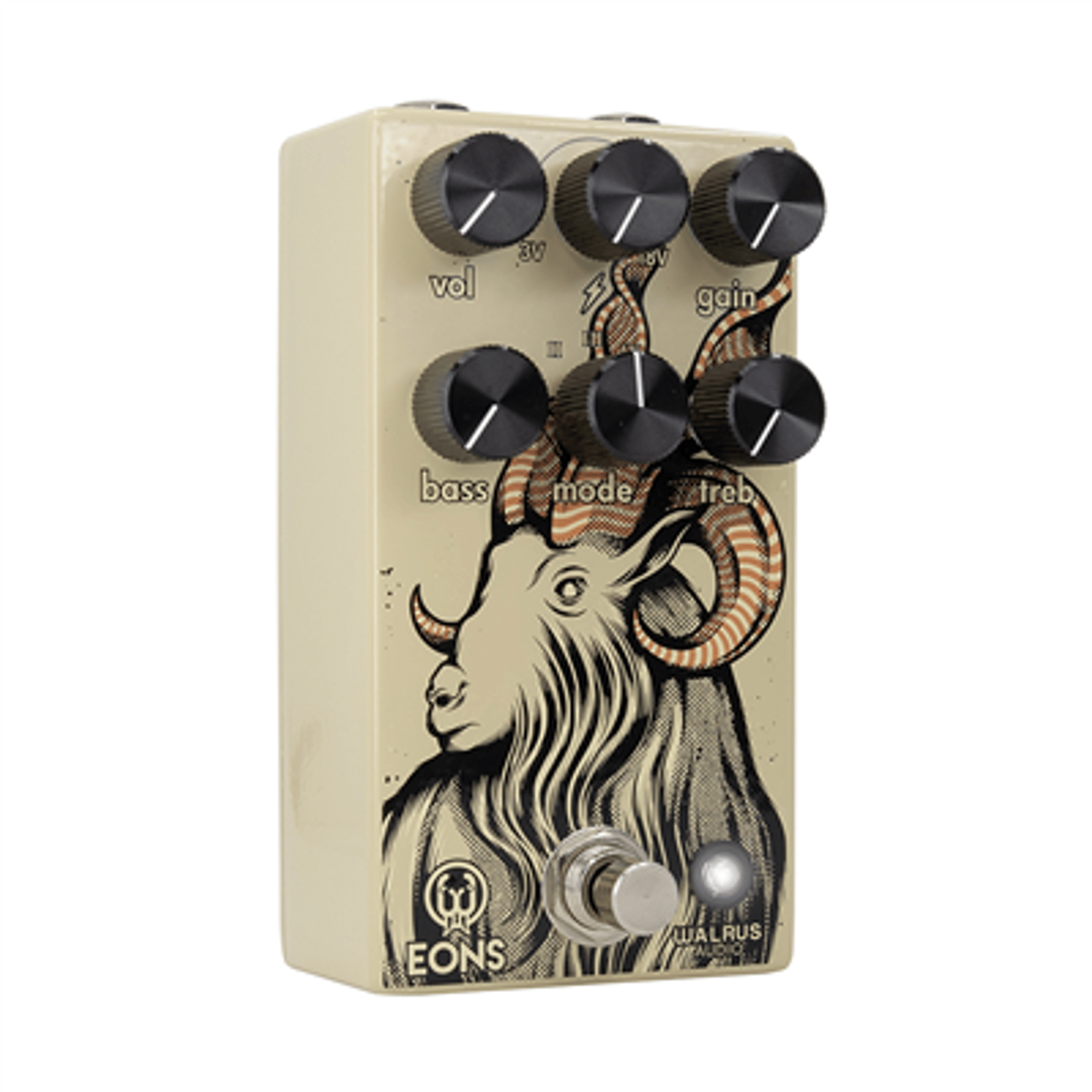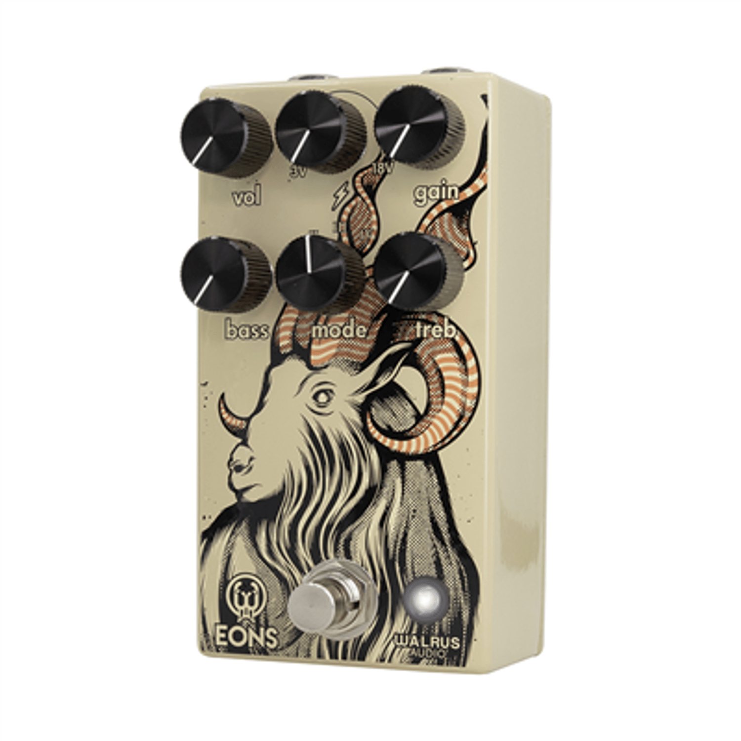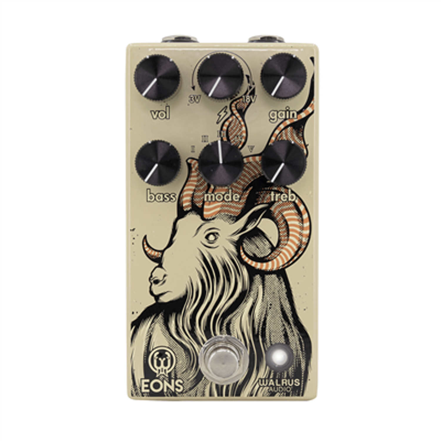Eons is a five-state fuzz capable of massively thick sounds ready to test the limits of any amp's grill cloth. Use the Voltage (lightning bolt) knob to crank up to 18 volts into the pedal's circuit for massive, open fuzz sounds, or choose to starve it down to 3 volts for spatty, gated fuzz. Experiment with the Voltage and Mode knobs for nearly endless styles of fuzz tones. Find vintage-inspired sounds emanating from the stages of Woodstock to chaotic three-chord punk rock. Eons is ready for a fight.