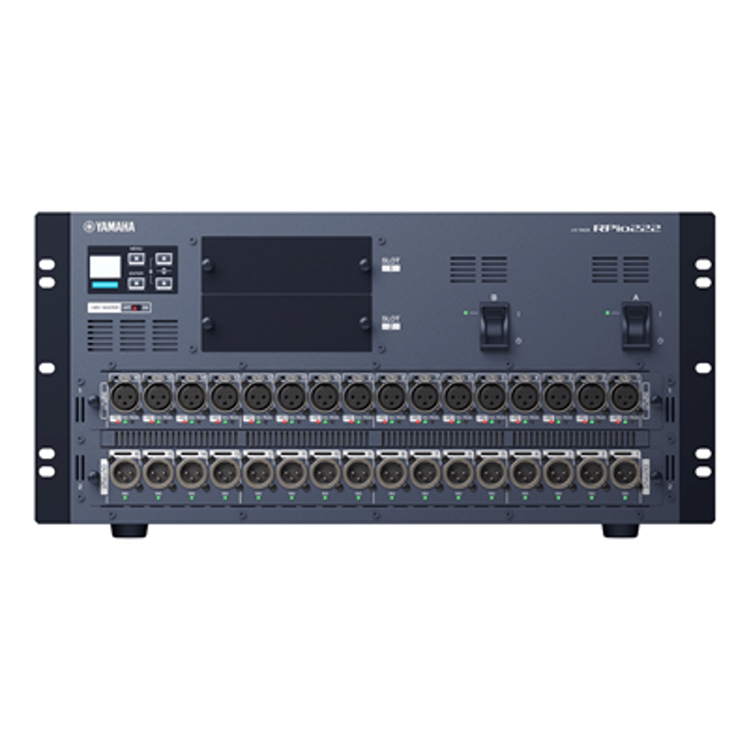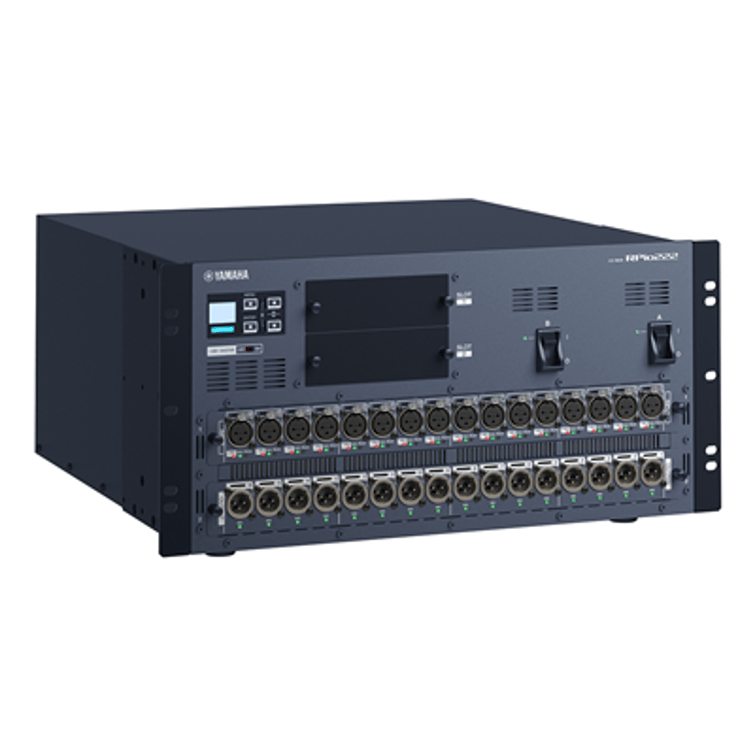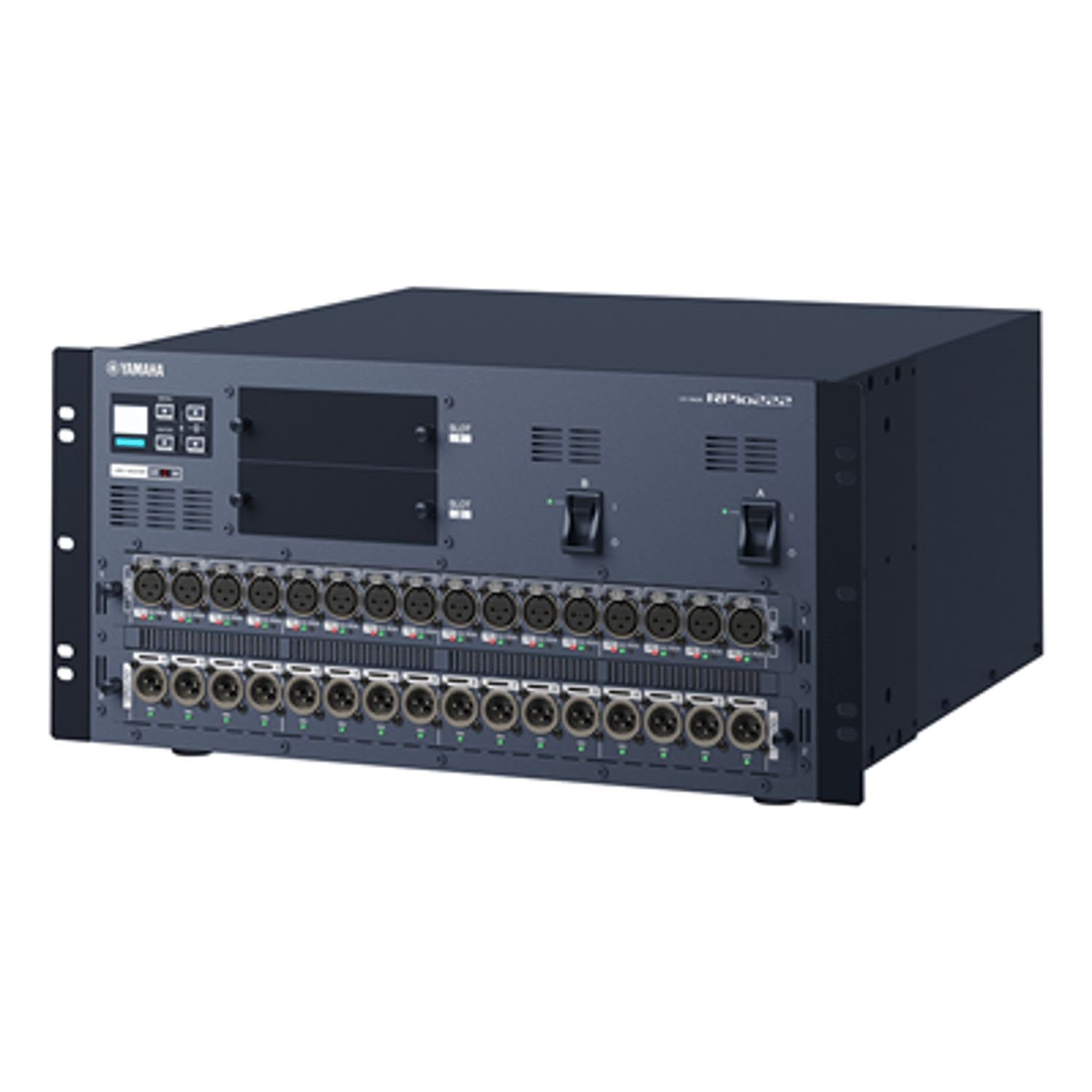 The RPio222 I/O rack features two RY card slots that provide flexible analog and digital I/O configuration and expansion capability for RIVAGE PM series systems employing low-latency TWINLANe networking. Dual power supply units are built in.