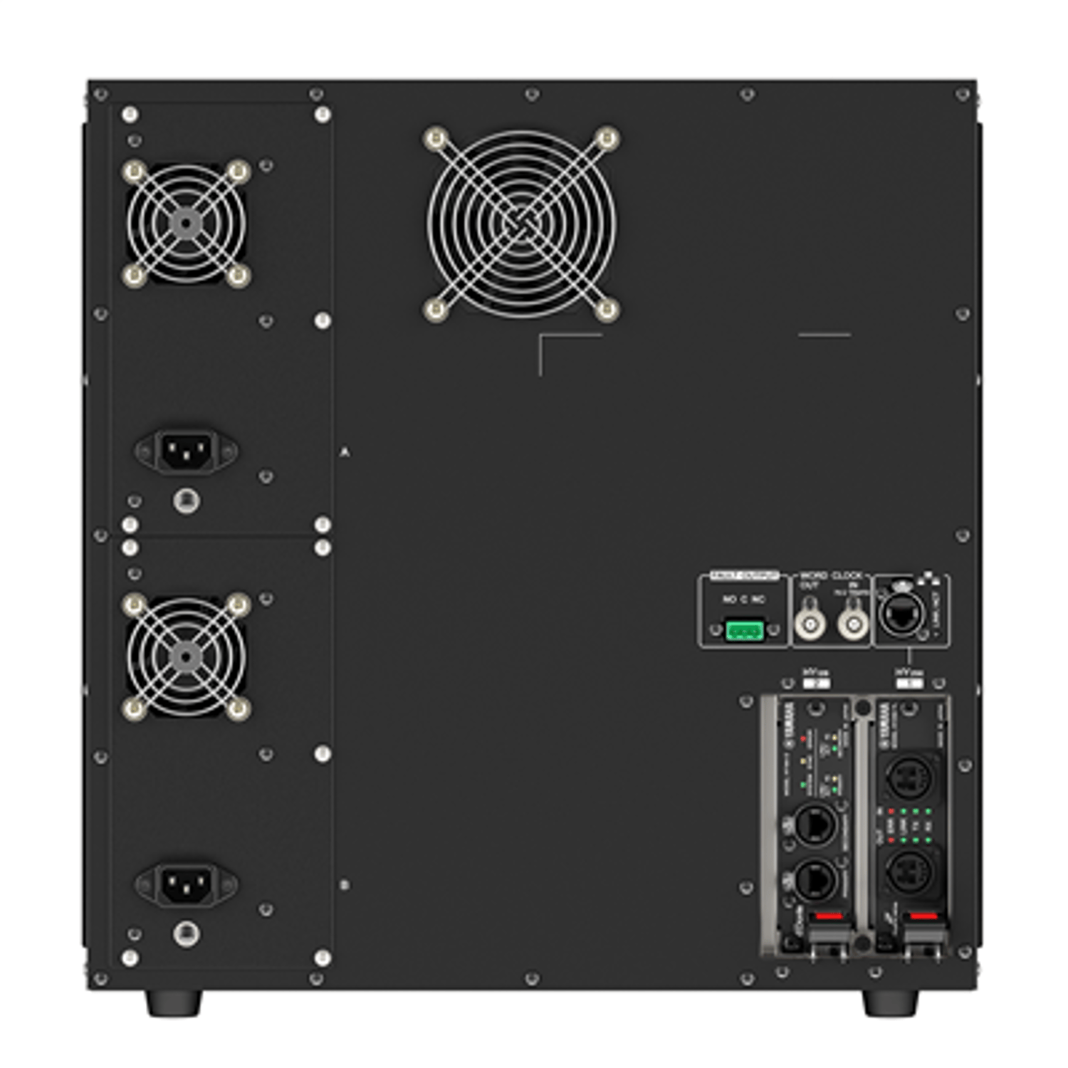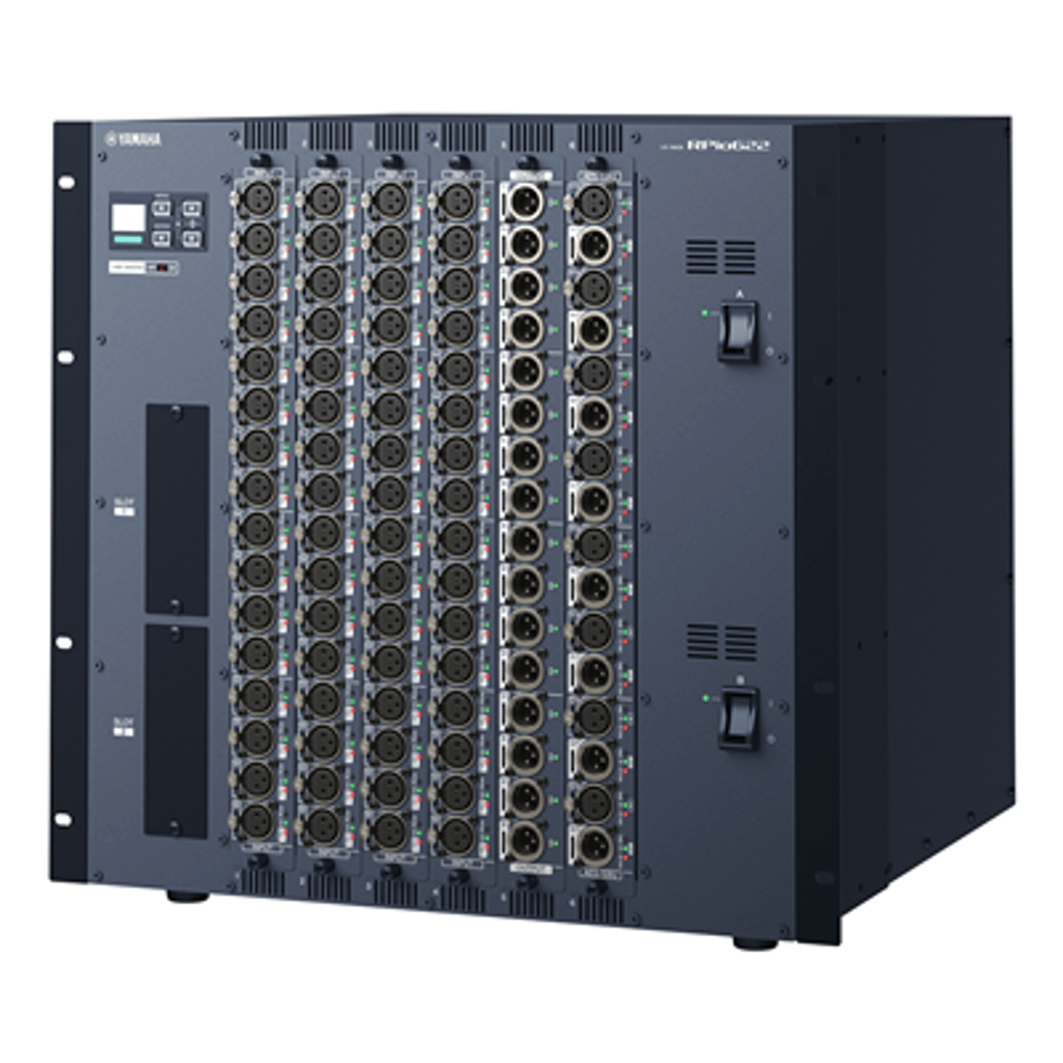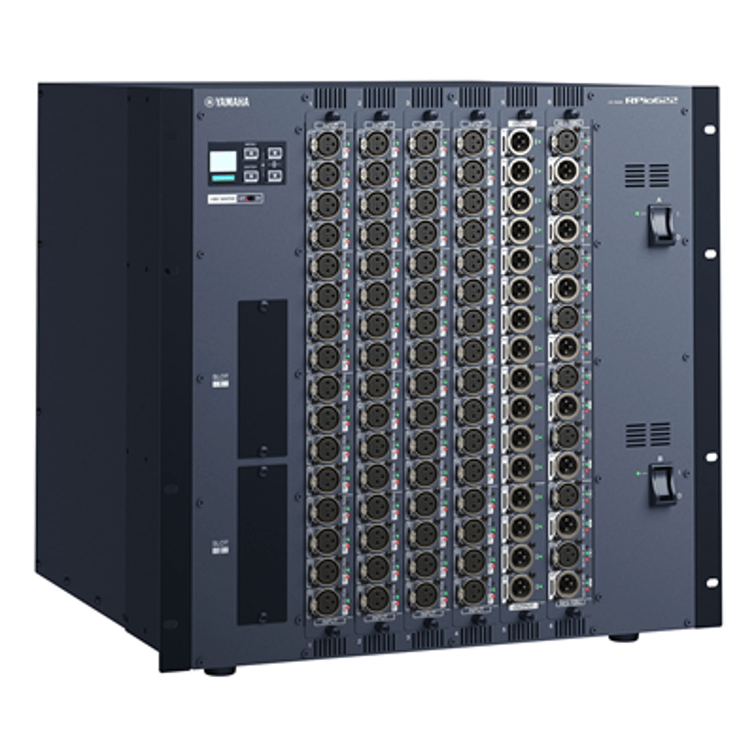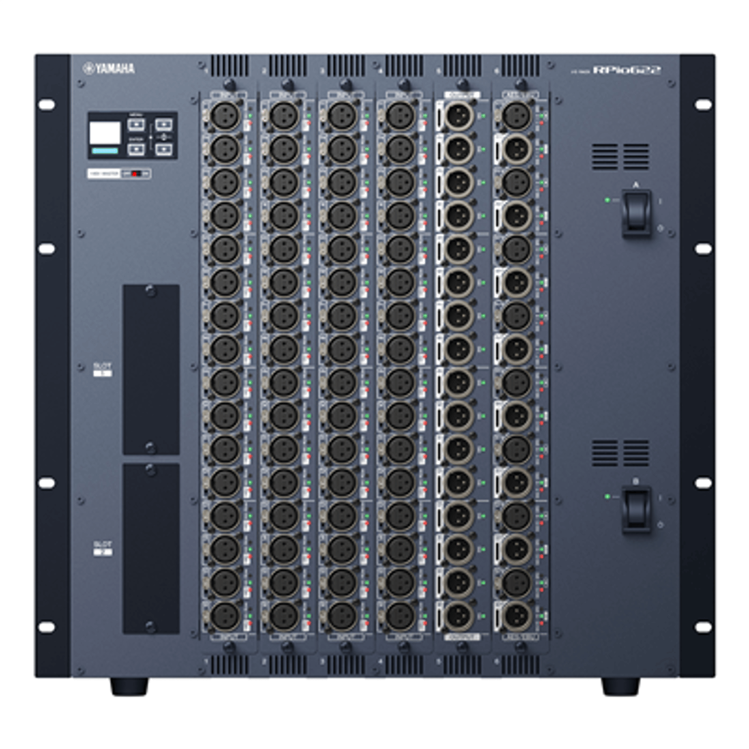 The RPio622 I/O rack features six RY card slots that provide flexible analog and digital I/O configuration and expansion capability for RIVAGE PM series systems employing low-latency TWINLANe networking. Dual power supply units are built in.